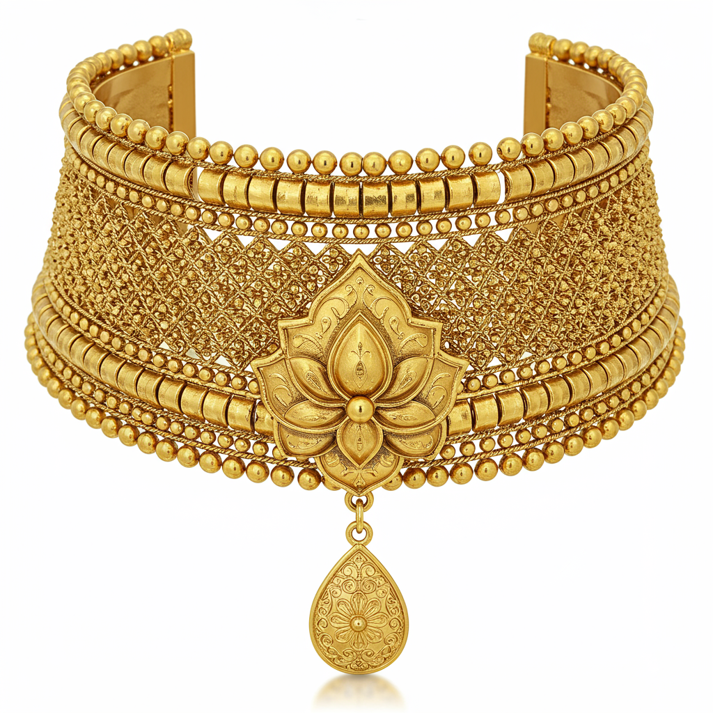 Set in 22Kt Yellow Gold (Net Weight 46.8 Gm) Oxodised Antique Gold Choker Nacklace, Famina Gold Palace