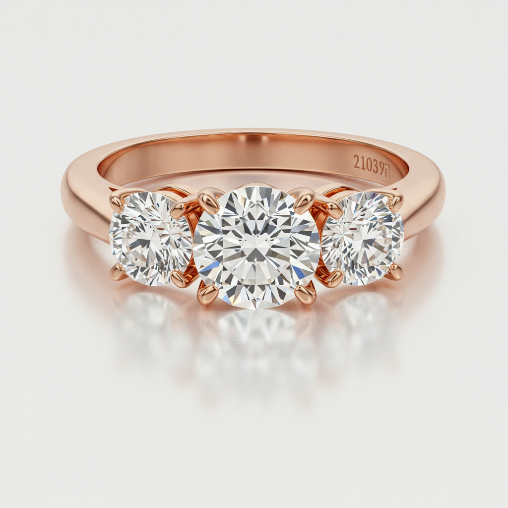 This mesmerizing rose gold ring features a classic three-stone design, symbolizing the past, present, and future of your journey. Crafted in radiant 18KT rose gold, its warm hue beautifully complements the brilliance of the diamonds. The setting securely holds high-quality VVS clarity stones, ensuring maximum fire and sparkle. This piece serves as the perfect token of everlasting commitment and sophisticated luxury.