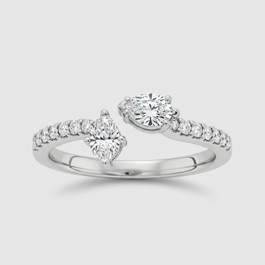 The Toi et Moi Ring embodies the romantic unity of two souls, represented by two magnificent center stones set side-by-side. This exquisite piece features an asymmetrical pairing of a classic pear-cut diamond and an elegant oval-cut diamond. Crafted in radiant 18KT white gold, the sophisticated setting ensures maximum brilliance and security. The dual stones, totaling 1.75 carats, create a stunning visual harmony. It is a timeless symbol of commitment, perfect for engagements or significant anniversaries.