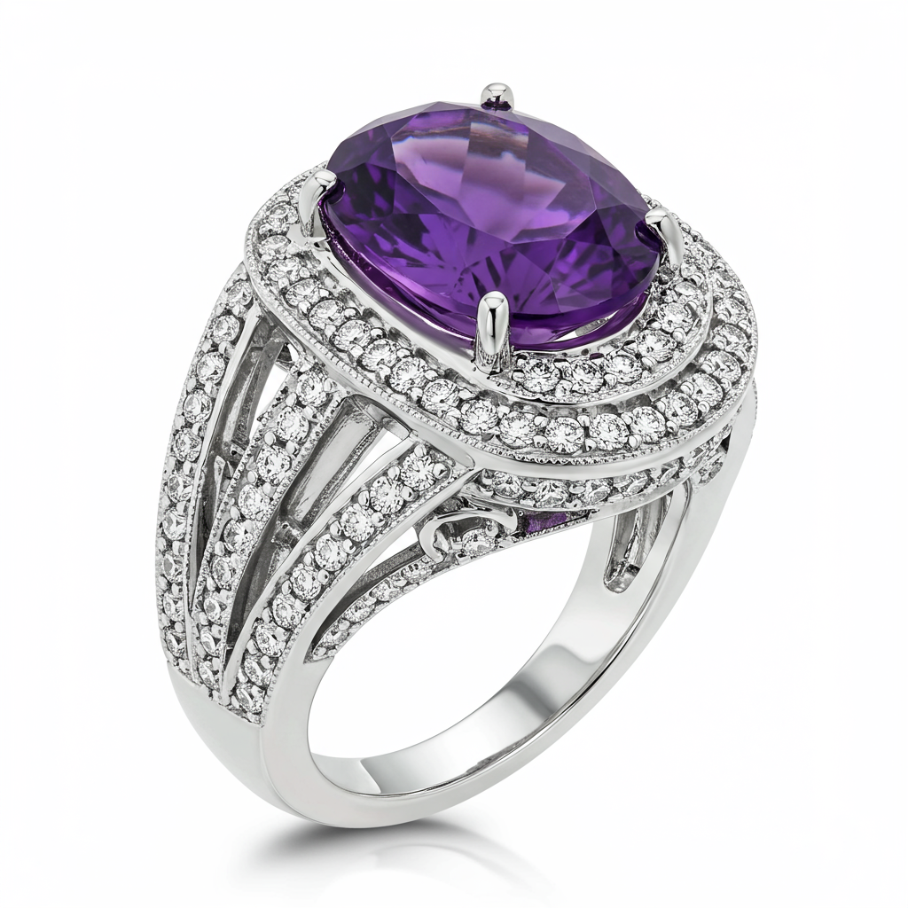 This breathtaking cocktail ring features a dramatic oval center stone cradled by a halo of brilliant, pavé-set diamonds. Crafted in luxurious 18KT white gold, the intricate setting ensures maximum light performance, creating unparalleled sparkle. This statement piece is designed for grand occasions, radiating sophistication and timeless glamour. Its bold silhouette makes it the perfect centerpiece for any evening attire.