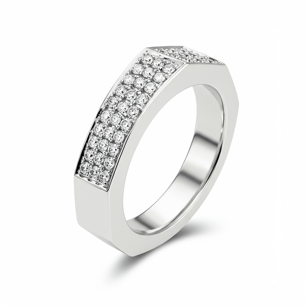 The 'D' Rings are an architectural marvel, blending sharp geometry with brilliant diamond sparkle. Crafted in sleek 18KT white gold, the unique curved profile offers a contemporary yet timeless aesthetic. Fifty meticulously set VVS diamonds line the contours, ensuring maximum brilliance from every angle. This versatile piece serves equally well as a stunning wedding band or a chic addition to any stack. Its refined structure elevates everyday luxury.