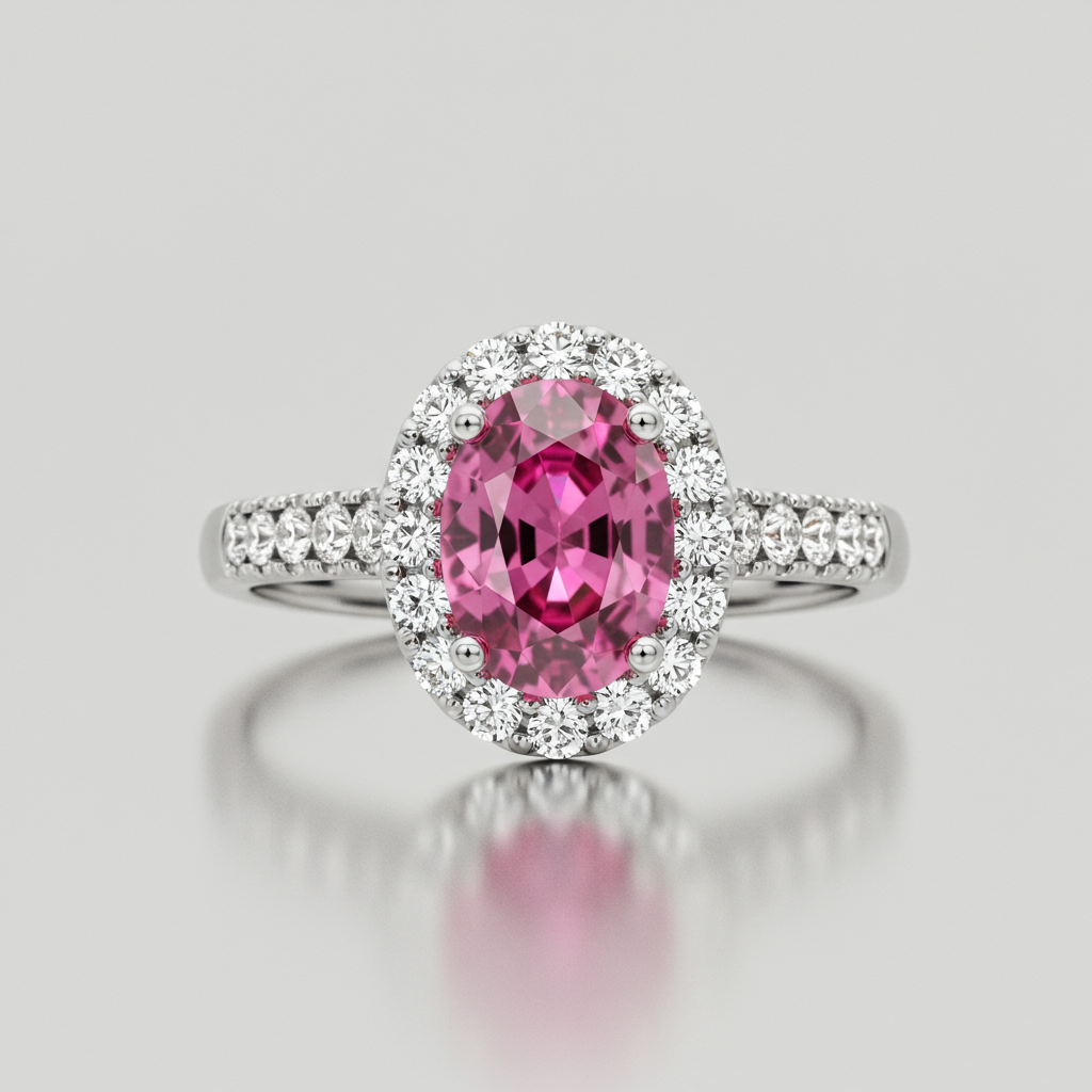 This exquisite Pink Sapphire Halo Ring captures breathtaking radiance, featuring a magnificent oval-cut center stone. Surrounded by a brilliant constellation of VVS accent diamonds, the design enhances the vibrant color of the sapphire. Crafted in luxurious 18KT white gold, the meticulous pave setting continues halfway down the band. This piece embodies sophisticated romance and timeless elegance, perfect for a grand proposal or special anniversary.