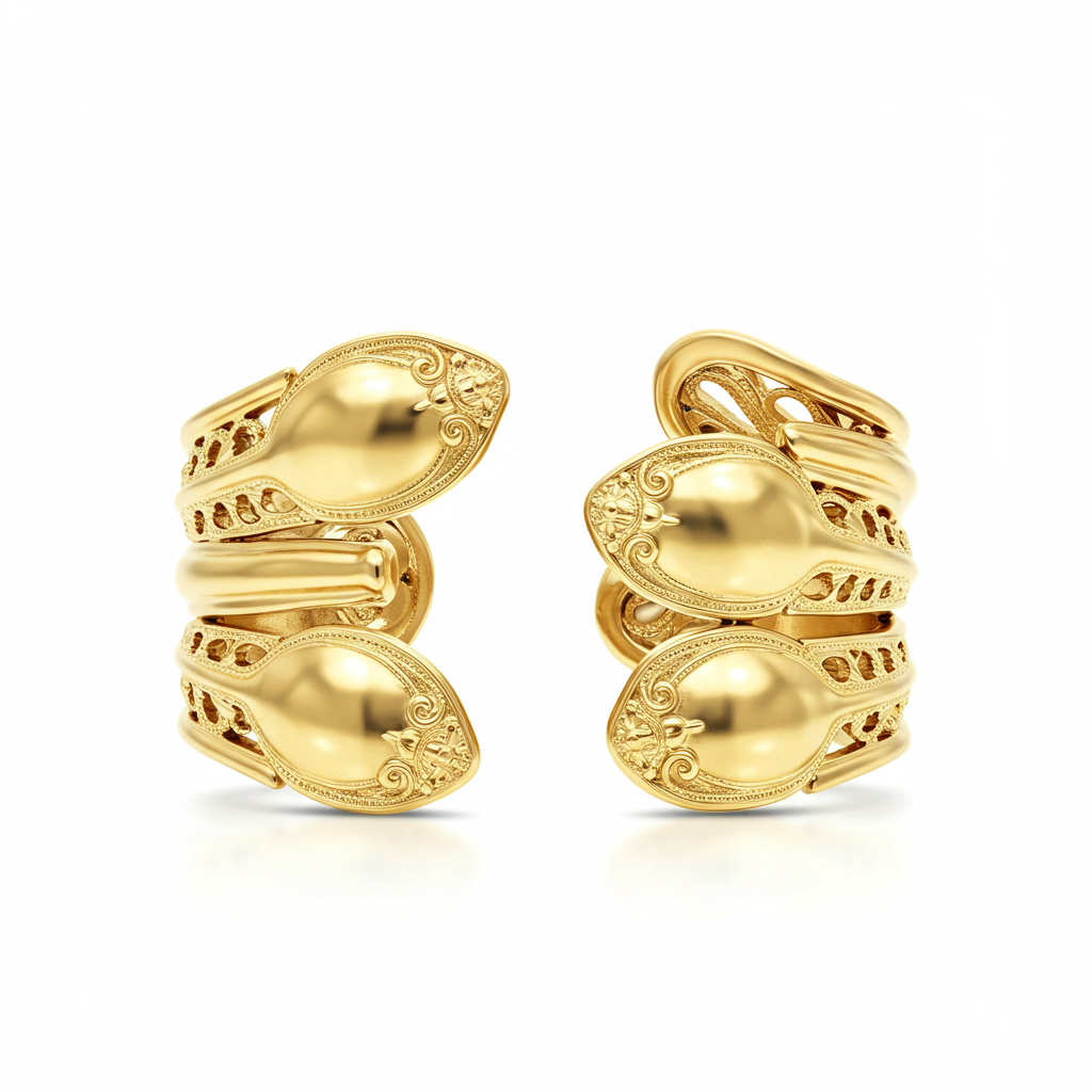 The 'spoon rings' design is a remarkable blend of vintage charm and modern luxury. Crafted from polished 18KT Yellow Gold, its intricate cuff structure wraps elegantly around the finger, offering a bold yet comfortable fit. This piece captures the timeless artistry of repurposed silverware, reimagined here as a sophisticated, heirloom-quality statement ring. The slightly overlapping band provides an unmistakable, fluid aesthetic. This is an essential accessory for those who appreciate history interpreted through high fashion.