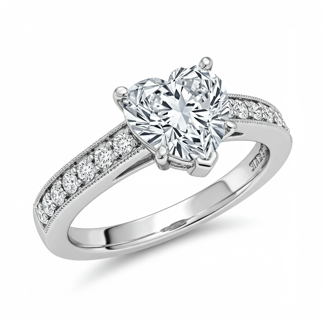 Celebrate eternal devotion with this magnificent Heart Diamond Ring, showcasing a breathtaking heart-shaped center stone that captures light from every angle. The stone is meticulously set in highly polished 18KT white gold, symbolizing purity and lasting commitment. Delicate micro-pave diamonds adorn the shoulders of the band, lending an extra layer of brilliance and sophistication. This piece is a perfect blend of romantic design and superior craftsmanship, ideal for an engagement or anniversary gift.