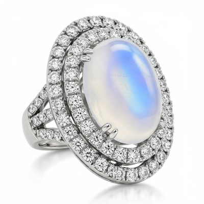 The Moonstone Cocktail Ring captures ethereal beauty with its mesmerizing central gem. A large, luminous oval moonstone, known for its distinct adularescence, sits cradled within a brilliant halo of fine pavé diamonds. Crafted in lustrous 18KT white gold, this piece offers an elegant balance of mystical color and sophisticated sparkle. It is a statement accessory perfect for evening wear or adding a touch of sophisticated glamour to any ensemble.