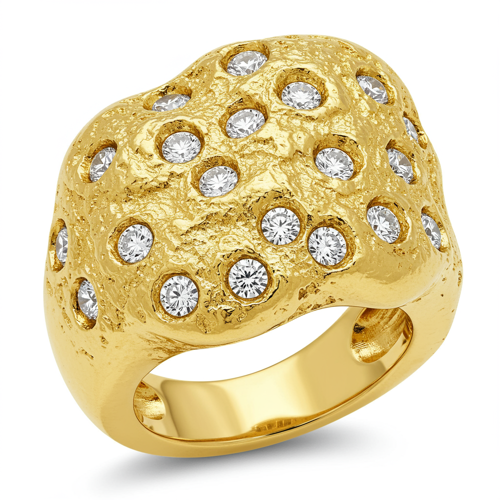 The 'nugget rings' epitomize rugged luxury, crafted from solid 18KT yellow gold. This statement piece features a meticulously textured surface, simulating the organic, raw beauty of a freshly mined gold nugget. Scattered brilliant-cut diamonds are seamlessly integrated into the uneven topography, providing unexpected flashes of light. It is a bold and distinctive design intended for the wearer who appreciates unique craftsmanship and substantial presence.