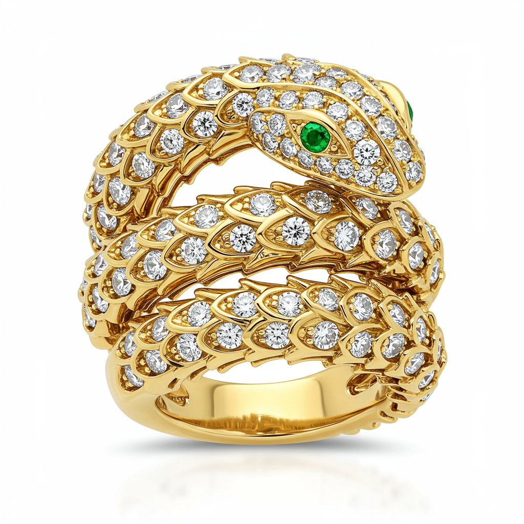 The Serpent Coil Ring is a masterpiece of symbolic jewelry, meticulously crafted to wrap the finger in luxurious 18KT yellow gold. This elaborate design features the body of the snake completely encrusted in high-quality VVS pave diamonds, giving it spectacular shimmer. Two vibrant emeralds are set as eyes, breathing life into the mesmerizing creature. Representing transformation and eternal love, this statement piece combines exceptional craftsmanship with timeless elegance, making it an unforgettable addition to any collection.