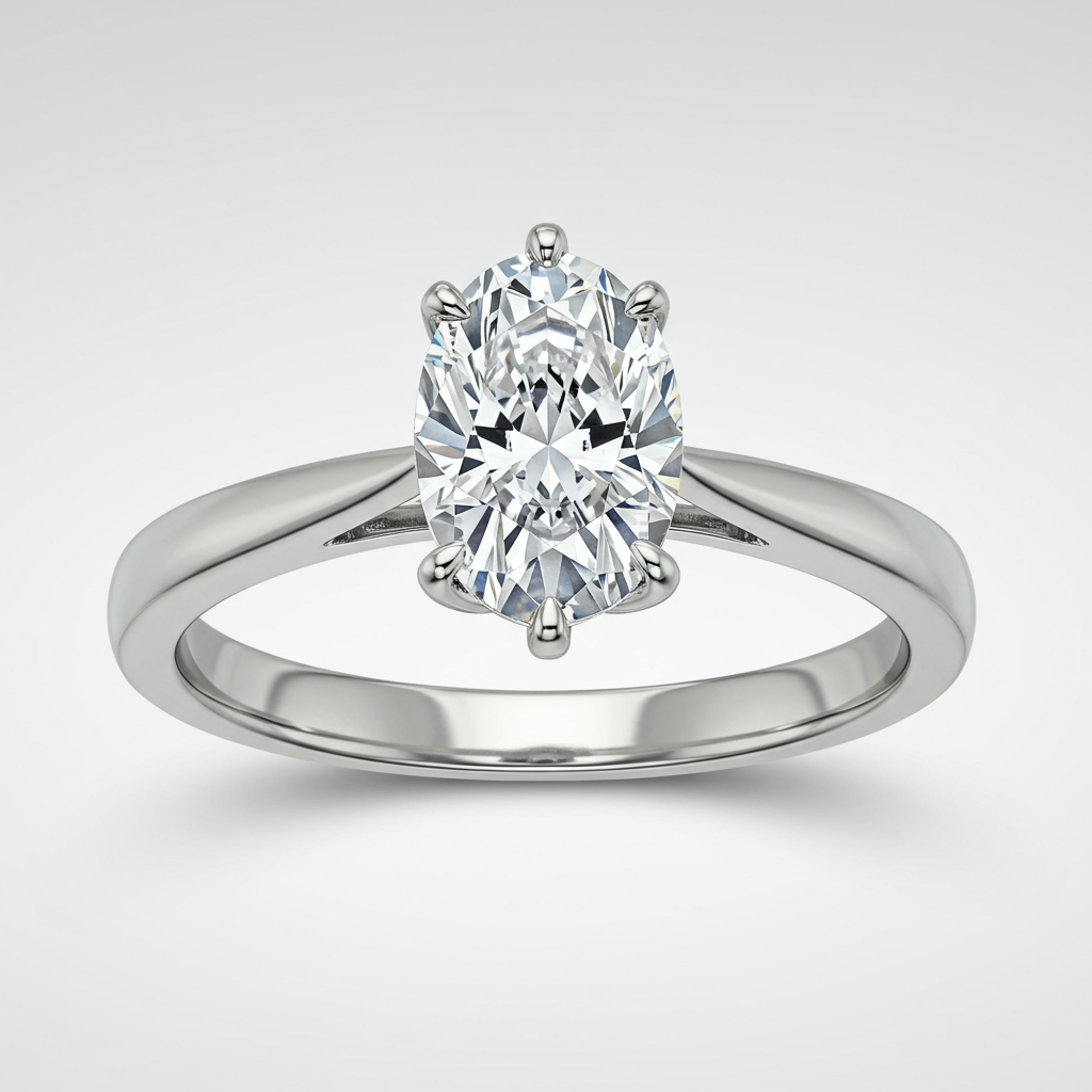 The Oval Diamond Engagement Ring is a masterpiece of timeless elegance, showcasing a magnificent 1.50 carat center diamond set upon a classic solitaire band. Expertly crafted in gleaming 18KT white gold, this ring emphasizes the brilliance and unique elongated silhouette of the oval cut. The minimalist four-prong setting allows maximum light exposure, ensuring breathtaking scintillation from the VVS clarity stone. This design perfectly symbolizes enduring love and sophistication for the modern bride.