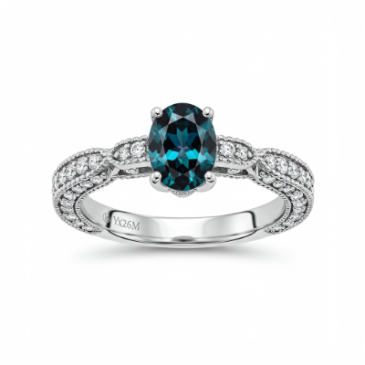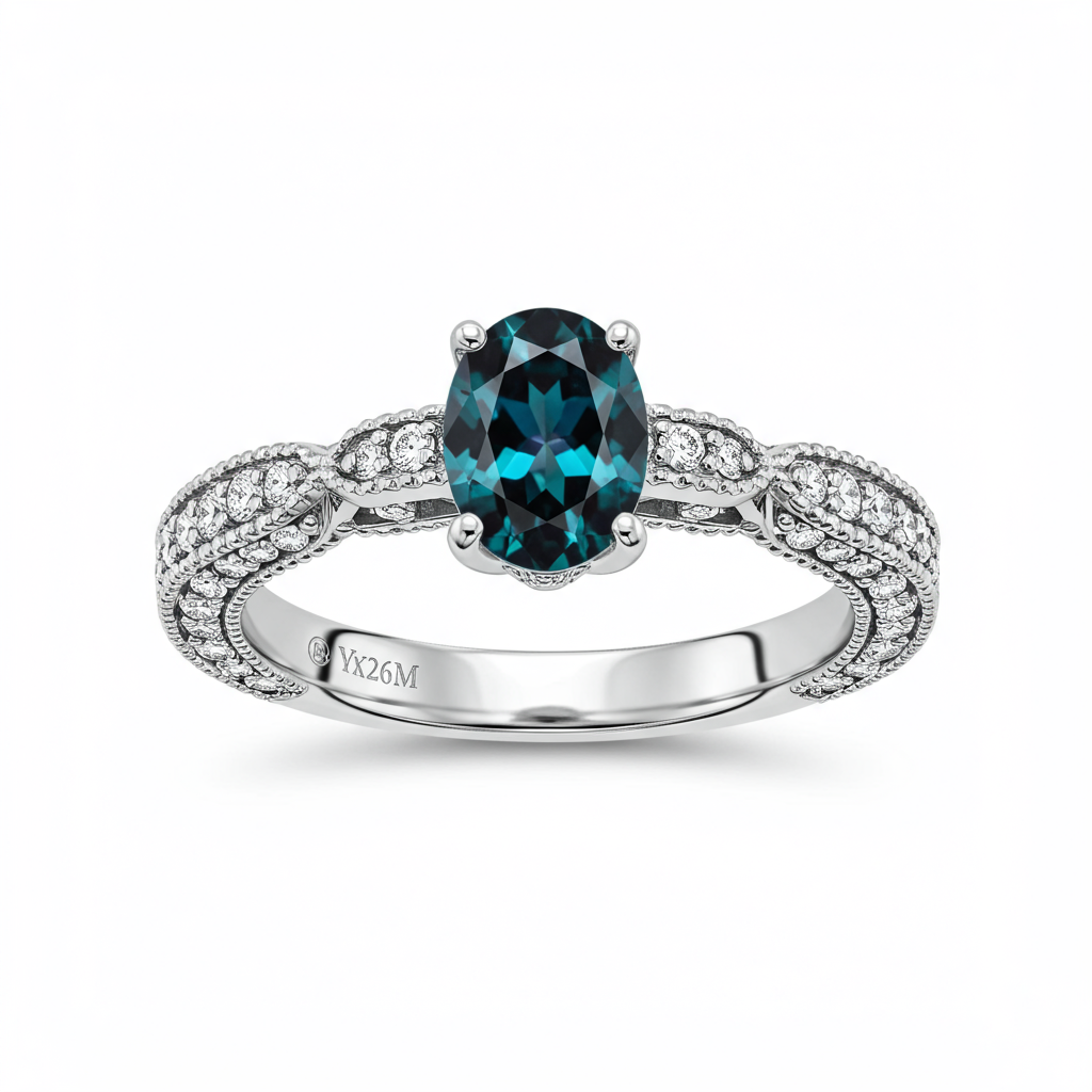 This exquisite engagement ring features a stunning centerpiece: a natural, color-changing Alexandrite set in polished 18KT white gold. The 1.50 carat oval center gem is beautifully framed by delicate pavé-set VVS diamonds along the sleek band. The Alexandrite's remarkable shift from blue-green daylight hues to purple-red incandescent tones makes this piece truly unique. This ring symbolizes transformation and eternal commitment, making it an heirloom-quality choice for a significant proposal.