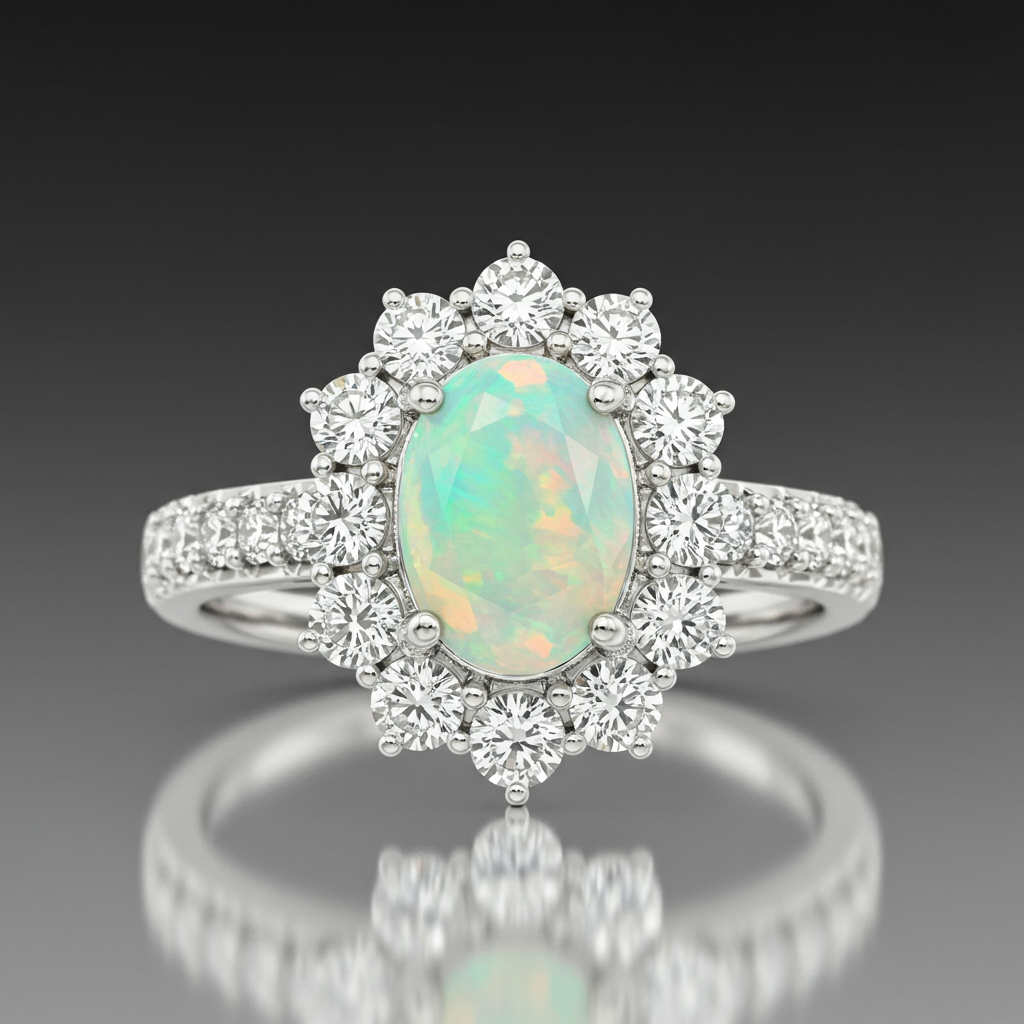 This exquisite ring features a mesmerizing center Australian Opal, celebrated for its intense play-of-color and ethereal glow. The central gemstone is elegantly framed by a brilliant halo of round VVS diamonds, set meticulously in lustrous 18KT white gold. The slender band enhances the opal's prominence, offering a sophisticated and timeless profile. This piece serves as a breathtaking statement accessory, perfect for celebrating life's significant milestones.