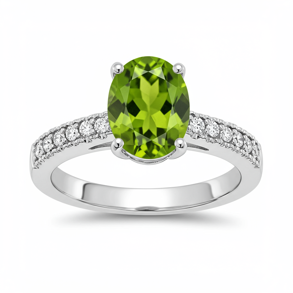 This exquisite peridot solitaire ring captures the light with its stunning central gemstone, symbolizing renewal and prosperity. Set in luxurious 18KT white gold, the vibrant green peridot is flanked by brilliant-cut VVS diamonds that enhance its natural radiance. The sleek, polished band offers a modern yet timeless silhouette. This piece is a true testament to sophisticated craftsmanship, making it an ideal signature accessory or meaningful gift.