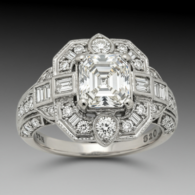 A magnificent 18KT white gold engagement ring capturing the geometric elegance of the Art Deco era. This piece features a striking central Asscher-cut diamond framed by precision-set baguette and round brilliant accents. The intricate metalwork and milgrain detailing showcase exceptional craftsmanship, offering a timeless symbol of commitment. Its vintage-inspired silhouette delivers breathtaking brilliance and sophisticated charm.