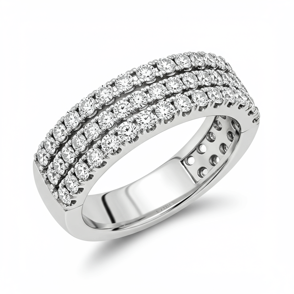 The Clatter Ring is a bold statement of modern luxury, meticulously crafted in radiant 18KT white gold. This exceptional band features three parallel rows completely engulfed in brilliant VVS round diamonds, achieving a spectacular display of light refraction. Its sophisticated design offers a comfortable fit while delivering maximum visual impact. Wear this ring alone for a dominant look or stack it for unrivaled texture and sparkle.