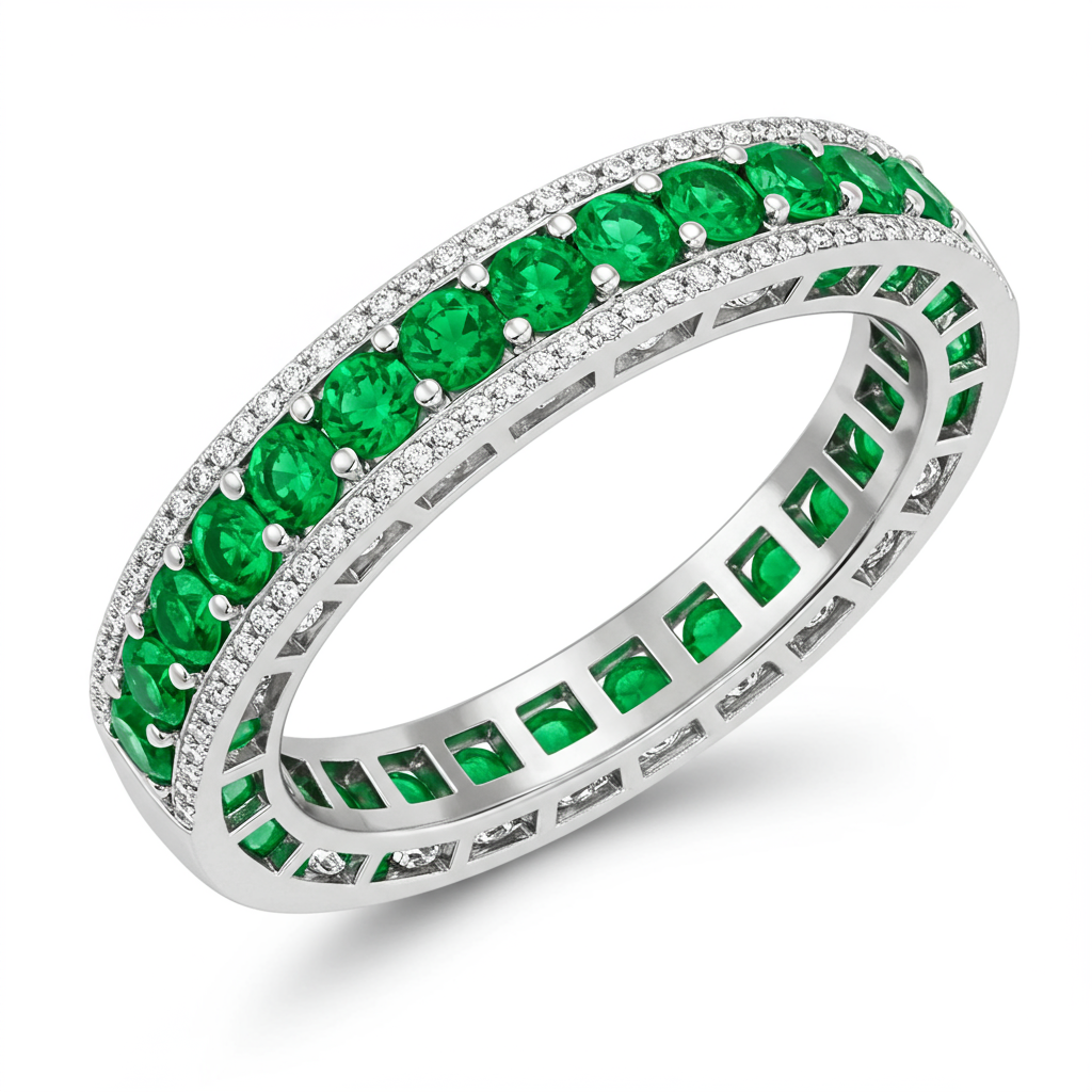 Celebrate your eternal bond with the Emerald Serenity wedding ring, a masterpiece crafted in luminous 18KT white gold. This striking band features a continuous line of vibrant, custom-cut emeralds, precision-set for seamless brilliance. Flanking the center stones are shimmering VVS diamond accents, enhancing the exquisite symmetry and depth of color. This ring serves as a timeless emblem of commitment, blending classic elegance with a bold, modern gemstone presence.