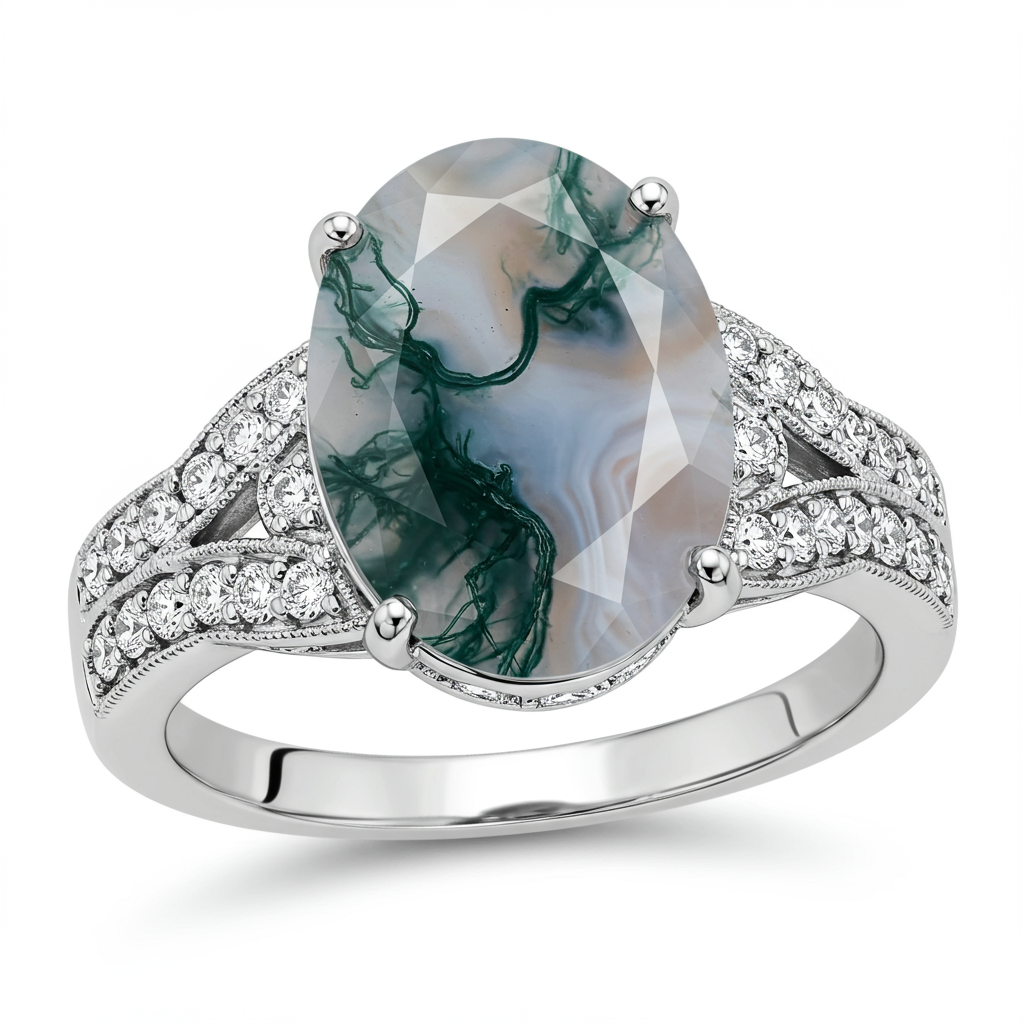 The Moss Agate Engagement Ring captures the untamed beauty of nature in a sophisticated setting. A captivating 10x8mm oval-cut moss agate, renowned for its delicate, natural inclusions that resemble verdant landscapes, sits proudly as the centerpiece. This stunning gem is complemented by a stream of micro-pave set VVS diamonds meticulously placed along the slender 18K white gold band. Crafted for the unique bride, this ring is a true symbol of everlasting growth and enduring romance, blending organic wonder with luxurious craftsmanship.