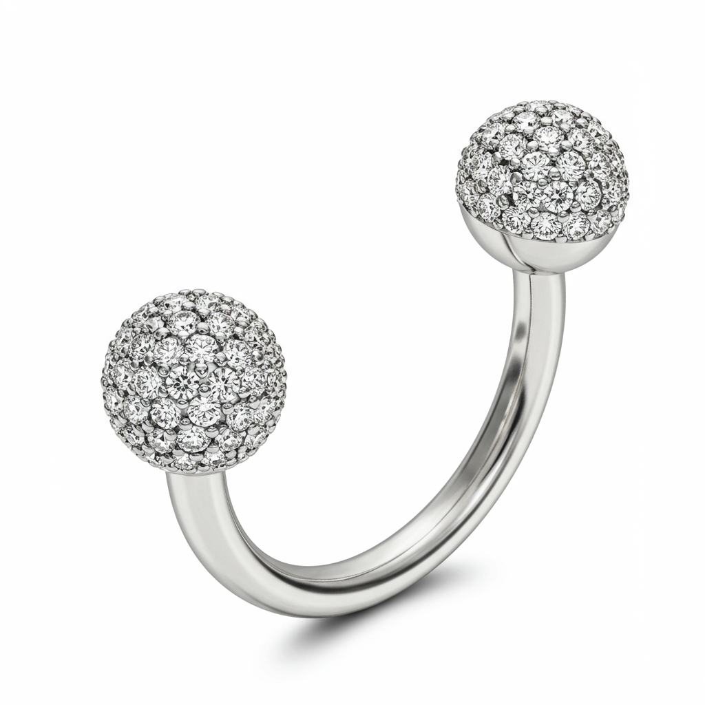 This 18KT white gold barbell offers sophisticated elegance for body piercing enthusiasts. It features meticulously set VVS diamonds on both end spheres, ensuring maximum brilliance and sparkle. Designed for comfort and secure wear, the piece combines luxurious materials with expert craftsmanship. This exquisite tongue ring transforms a simple piercing into a statement of high-end style.