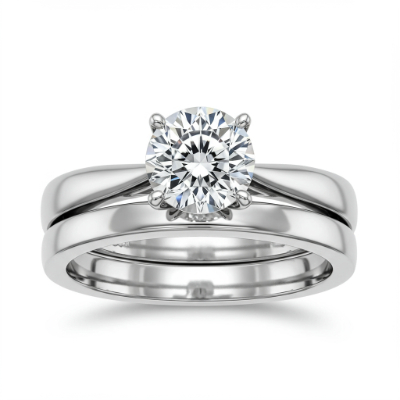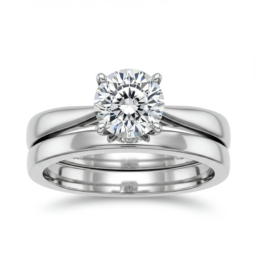 The ultimate symbol of commitment, this exquisite bridal set beautifully contrasts the brilliance of a classic solitaire engagement ring with the enduring elegance of a modern wedding band. The solitaire ring features a stunning center diamond held securely in a refined setting, maximizing light return and sparkle. Paired flawlessly with a high-polish 18KT white gold band, this duo represents the perfect union of glamour and timeless sophistication. This comprehensive set is designed to sit flush, embodying the promise of a lifetime commitment.