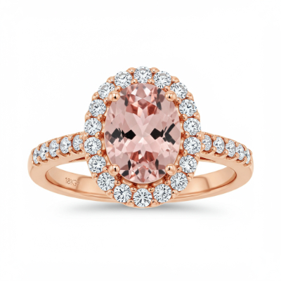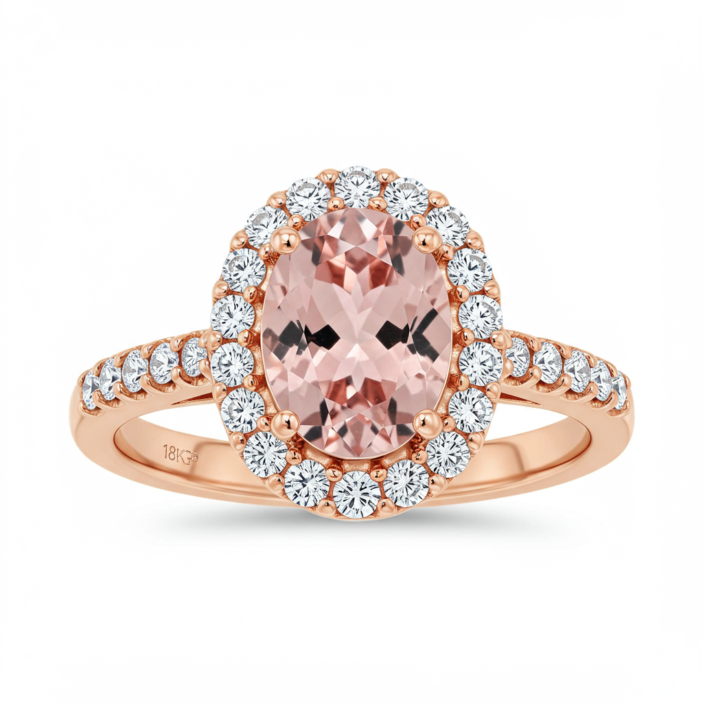 This breathtaking halo ring showcases a mesmerizing oval-cut Pink Morganite, celebrated for its delicate blush hue. The exquisite center stone is enveloped by a shimmering halo and set upon a pavé-diamond band crafted from luxurious 18KT Rose Gold. The VVS clarity accent diamonds provide brilliant fire, beautifully complementing the soft color of the morganite. This timeless design fuses modern elegance with classic romance, making it an exceptional statement piece.