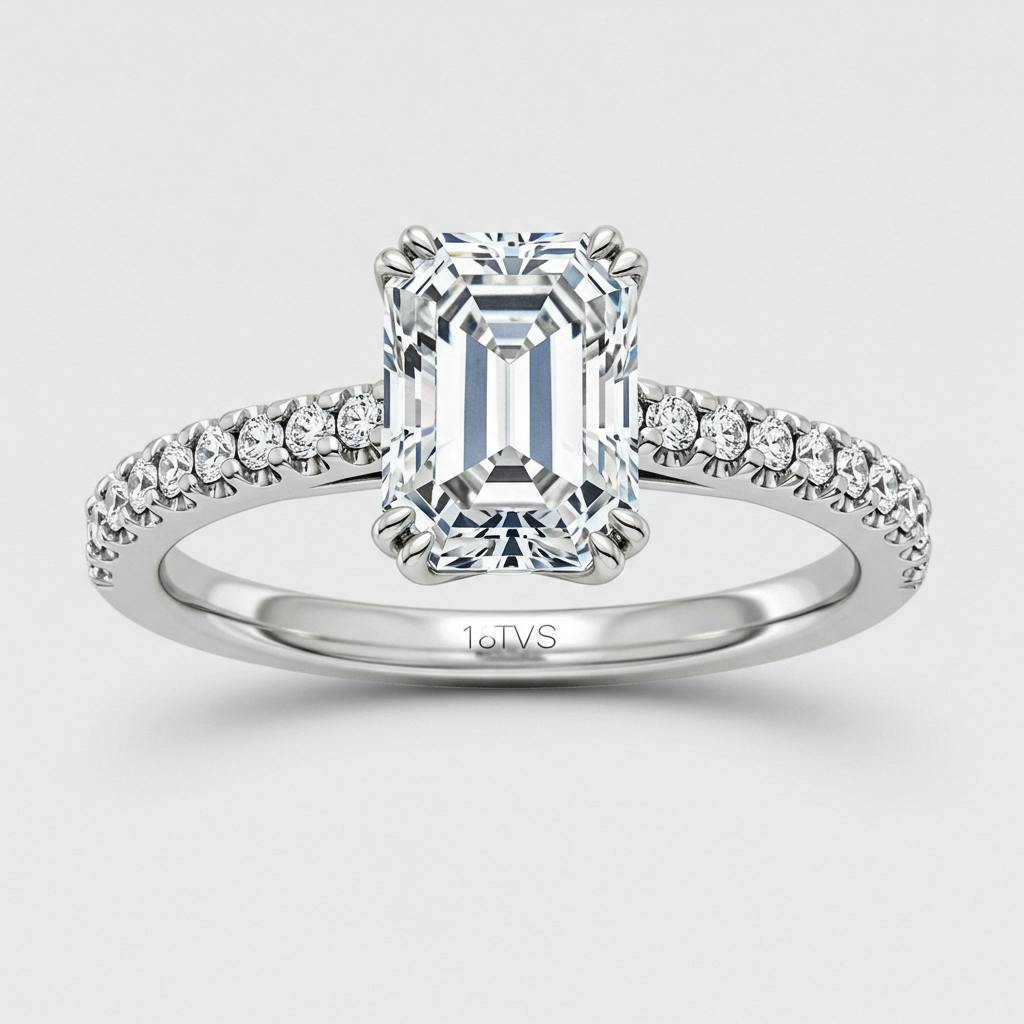 This exceptional oblong engagement ring showcases a breathtaking central diamond, expertly held by minimalist prongs that maximize light return. Crafted in luminous 18KT white gold, the slender band is adorned with pavé-set accent diamonds, lending unparalleled brilliance to the design. The elongated center stone provides a flattering, sophisticated silhouette on the finger. This ring is a timeless symbol of enduring love and exquisite craftsmanship.