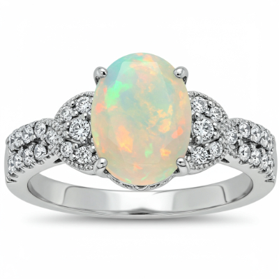 This opulent opal engagement ring celebrates unique sophistication, centering on a mesmerizing, ethically sourced oval opal known for its vibrant play-of-color. The luxurious 18KT white gold setting features delicate micro-pave accent diamonds (VVS clarity) tracing the band, enhancing the central stone's brilliance. Designed for the modern romantic, this piece seamlessly blends classic elegance with a distinct, contemporary flair. It is a stunning symbol of a one-of-a-kind love story.