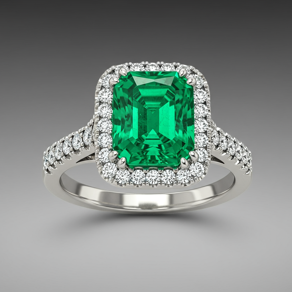 The Emerald Luminance Ring is a masterpiece of precision and vibrant color, centered around a breathtaking rectangular cushion-cut emerald. This striking gemstone is elegantly haloed by perfectly matched VVS round diamonds, maximizing its overall brilliance. Set entirely in radiant 18KT white gold, the sophisticated micropave shank adds a continuous sparkle. This exquisite piece symbolizes timeless elegance and luxurious, enduring commitment.