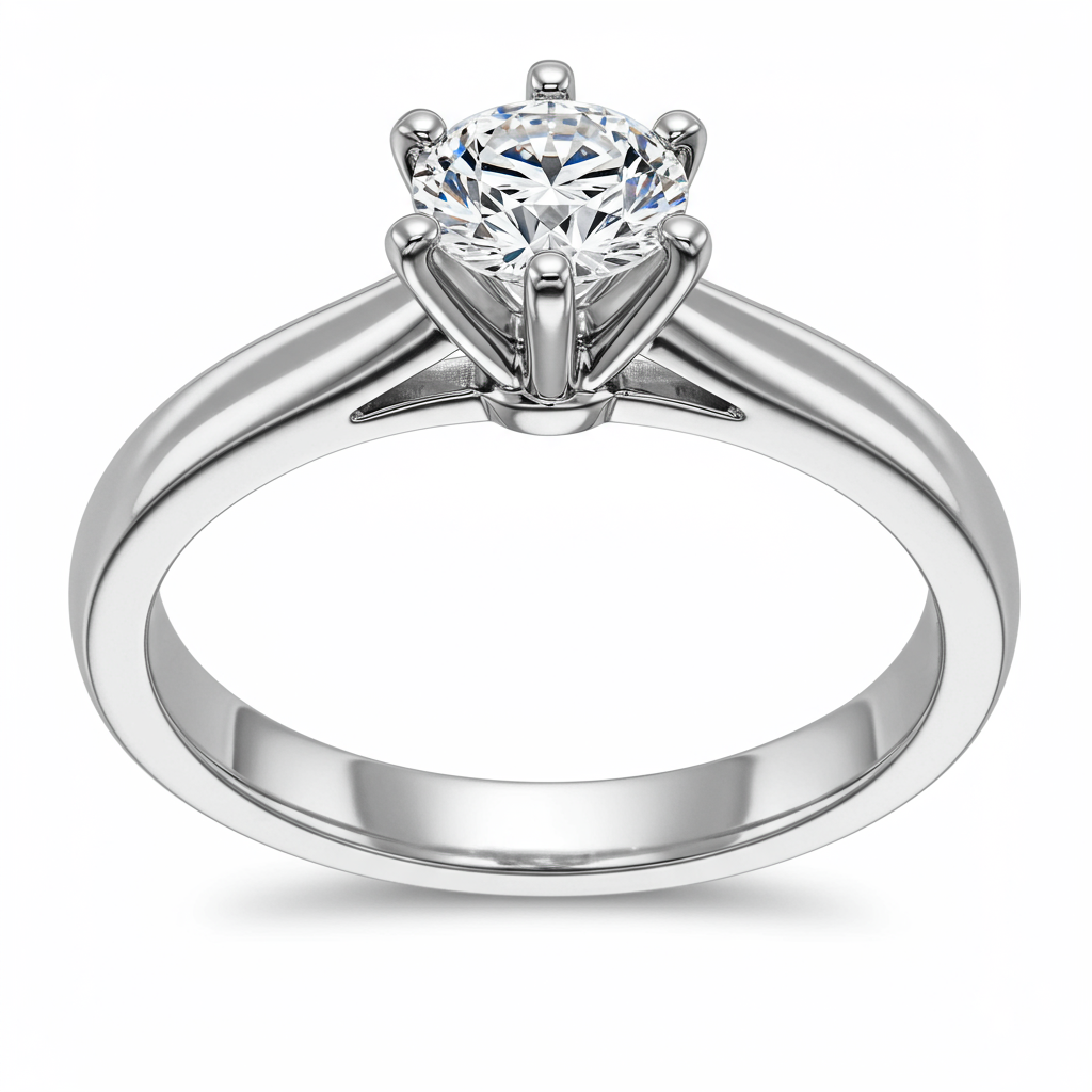 This Silver Solitaire Ring embodies timeless elegance and refined craftsmanship. Centered around a dazzling Round Brilliant diamond, the design features a delicate yet sturdy 18KT white gold band. The secure six-prong setting maximizes light exposure, ensuring breathtaking brilliance from every angle. This classic piece serves as the ultimate symbol of commitment or a luxurious everyday statement accessory.