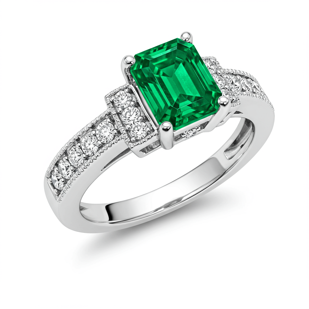 This exquisite engagement ring centers a magnificent 1.50 carat emerald-cut natural emerald, radiating deep verdant color. Set in lustrous 18KT white gold, the elegant band is meticulously adorned with eighteen VVS round brilliant diamonds. The precision setting and classic design create a timeless piece, perfect for celebrating enduring love and commitment. It represents the pinnacle of sophistication and handcrafted luxury.