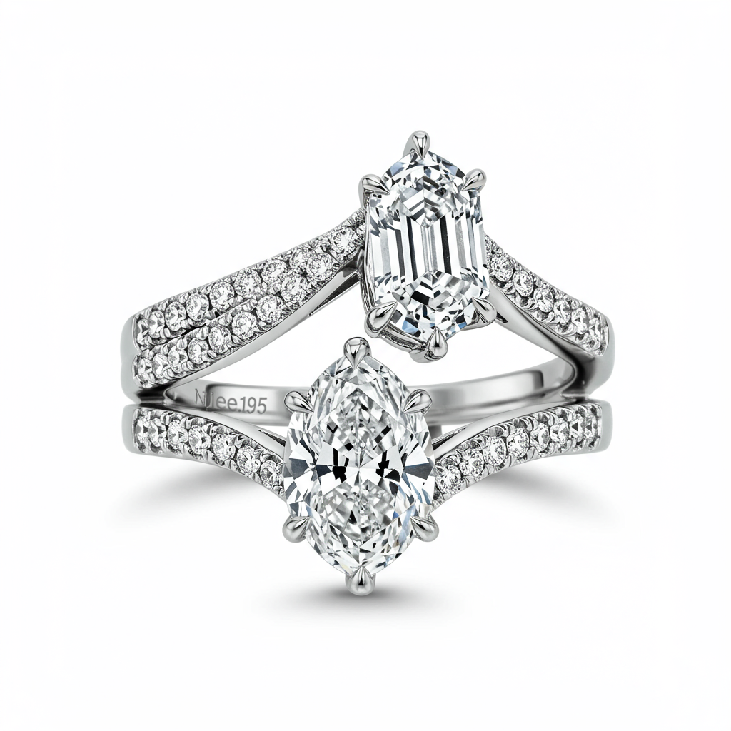 The iconic Megan Fox inspired Toi et Moi ring features a striking interlocking band design, symbolizing two souls becoming one. This statement piece showcases two magnificent center stones: a large pear-cut diamond and an emerald-cut diamond, set head-to-head in a unique, thorny bezel-like configuration. Crafted in highly polished 18KT white gold, the bands are accented with subtle pave diamonds for added sparkle. The exceptional VVS clarity of all stones captures the essence of passionate, unconventional romance and eternal commitment.