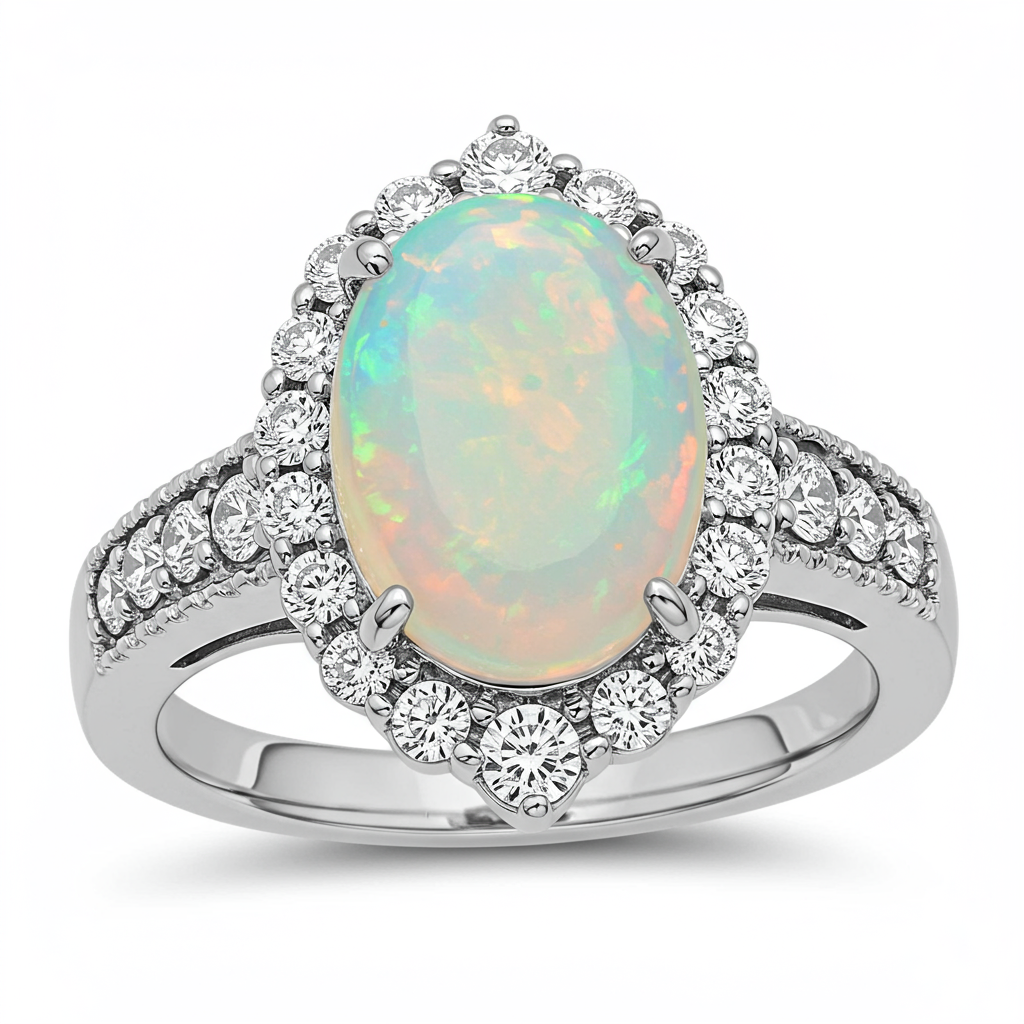 This exquisite 18KT white gold ring features a mesmerizing 1.80 carat oval Opal center stone, renowned for its brilliant play-of-color. The vibrant main gem is encircled by a dazzling halo of perfectly matched VVS clarity, G color round diamonds, maximizing light return and brilliance. The sophisticated design seamlessly blends classic luxury with modern artistry. Crafted for enduring beauty, this ring serves as a stunning statement piece for any collection or special occasion.