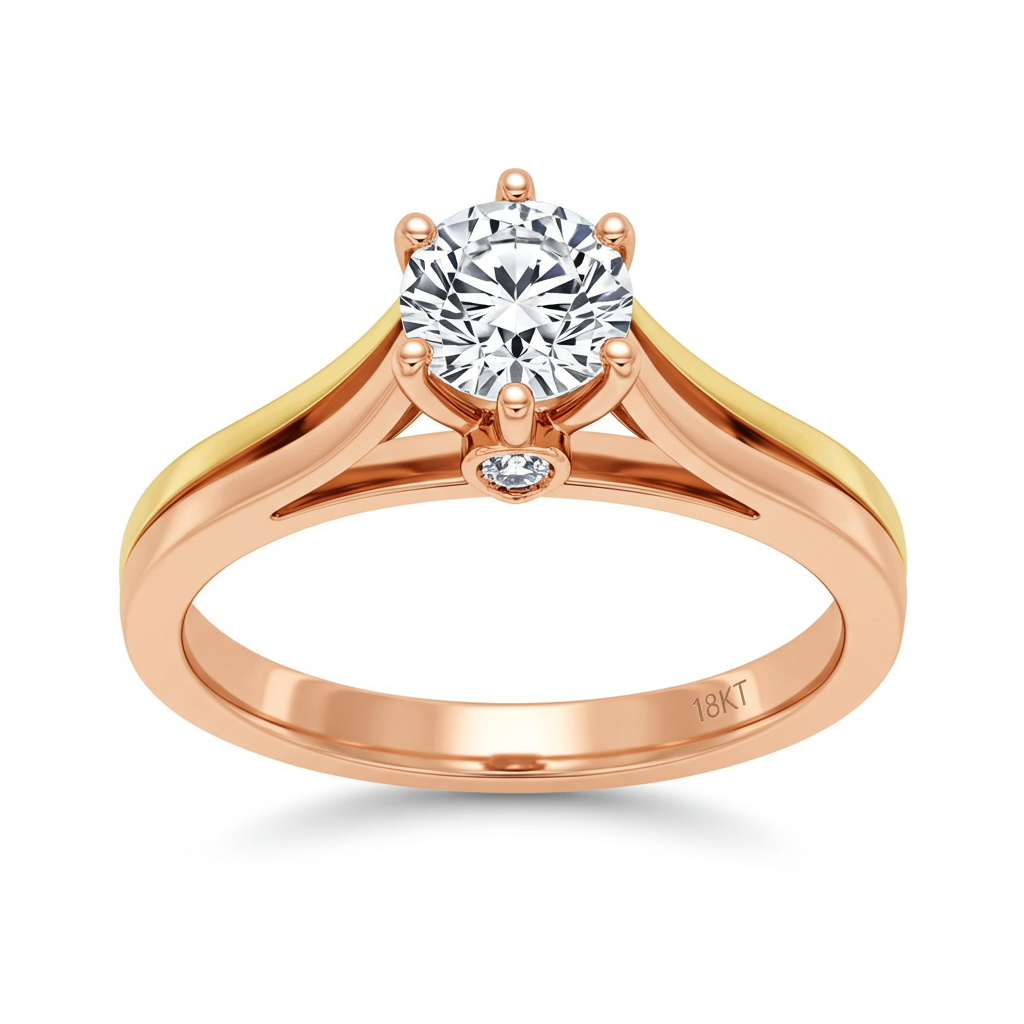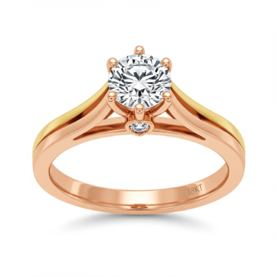 This exquisite engagement ring masterfully blends the warmth of 18KT rose gold with the classic luster of yellow gold, creating a truly unique symbol of commitment. The elevated setting cradles a brilliant round diamond, maximizing its fire and brilliance from every angle. The tapered shank seamlessly transitions between the two precious metals, offering a modern yet timeless appeal. Crafted for durability and beauty, this luxurious piece is designed to signify enduring love and sophistication.