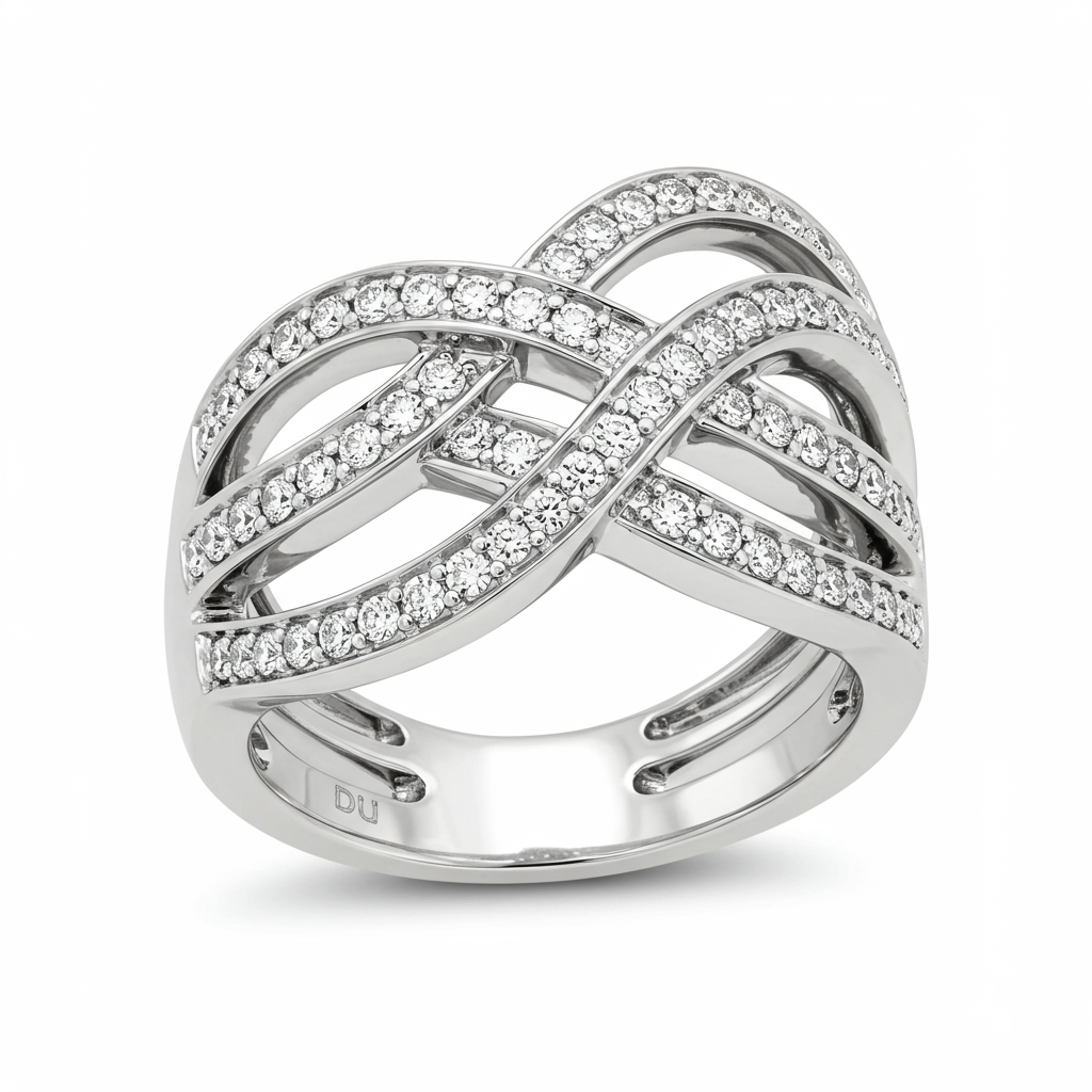The 'du ring' is an architectural masterpiece, defined by its dynamic interplay of curved 18KT white gold lines that seem to intertwine endlessly. This luxurious cocktail ring is meticulously set with brilliant VVS diamonds, creating a cascade of light and unparalleled sparkle from every angle. Its voluminous yet elegant silhouette makes it a powerful statement piece for sophisticated evening wear. Crafted for the connoisseur, this design represents the zenith of modern jewelry artistry and engineering.