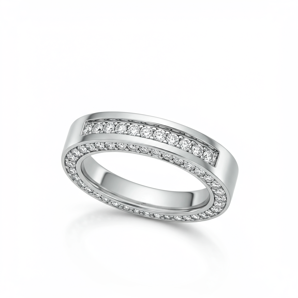 The Frank Ocean Accent Ring is a statement piece of unparalleled minimalist luxury. Crafted in polished 18KT white gold, its robust architecture is subtly accented by a precise line of micro-pave diamonds. This elevated design embodies sleek modernity and artistic rebellion, ensuring a bold aesthetic impact. It offers both profound symbolic significance and flawless craftsmanship, making it the ultimate accessory for the discerning collector.