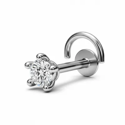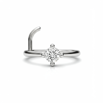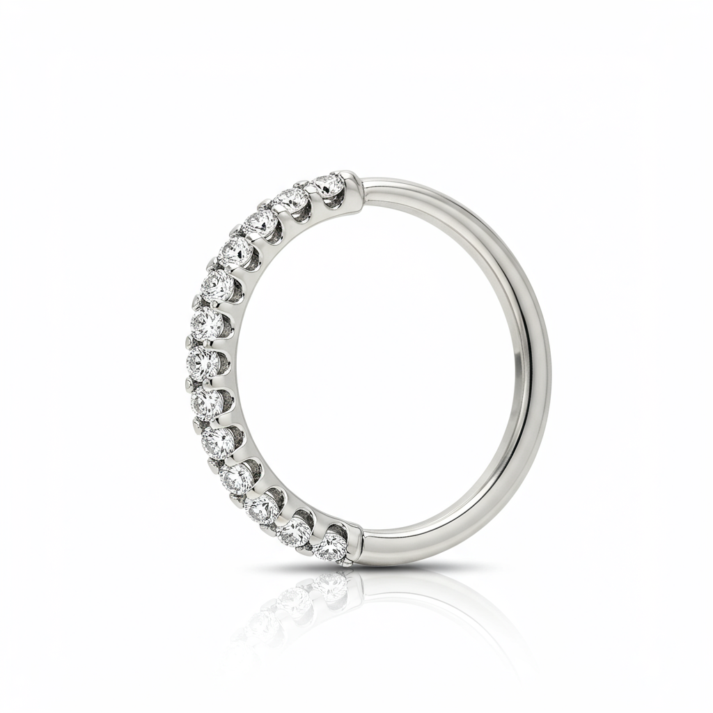 This elegant nose ringing features 18KT white gold crafted into a seamless hoop design, perfect for subtle sophistication. It is meticulously micro-pave set with brilliant VVS clarity diamonds, ensuring maximum sparkle from every angle. The minimalist yet glamorous silhouette offers refined luxury for everyday wear or special occasions. This piece is the epitome of enduring quality and fine craftsmanship.