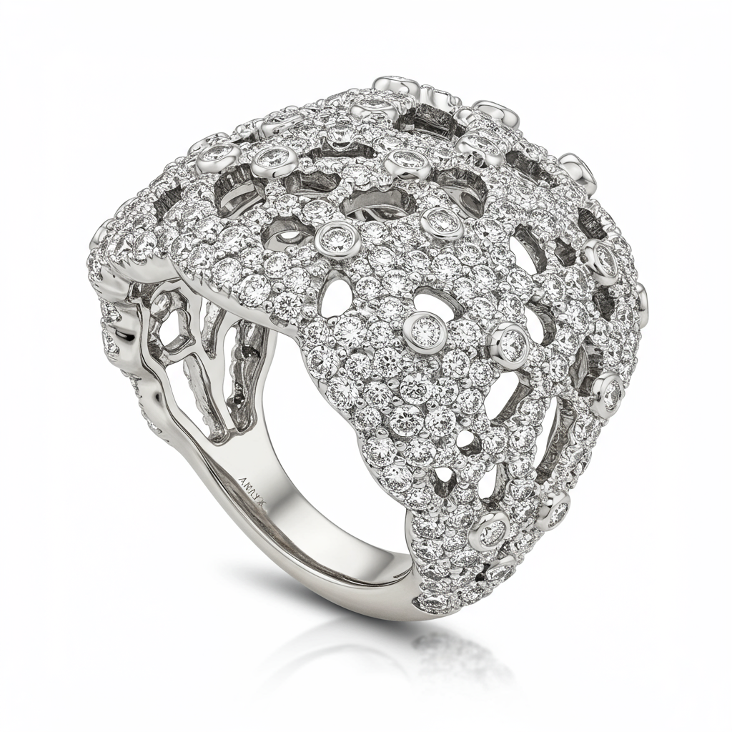 The 'Ring Shaped Reef' is an architectural marvel, meticulously designed to mimic the organic complexity and textural beauty of a coral formation. Crafted in luxurious 18KT white gold, the wide, domed band features undulating surfaces completely saturated with brilliant pave diamonds. This statement piece provides breathtaking sparkle from every angle, making it an unforgettable addition to any high jewelry collection. It is a symbol of dynamic elegance and exceptional craftsmanship.