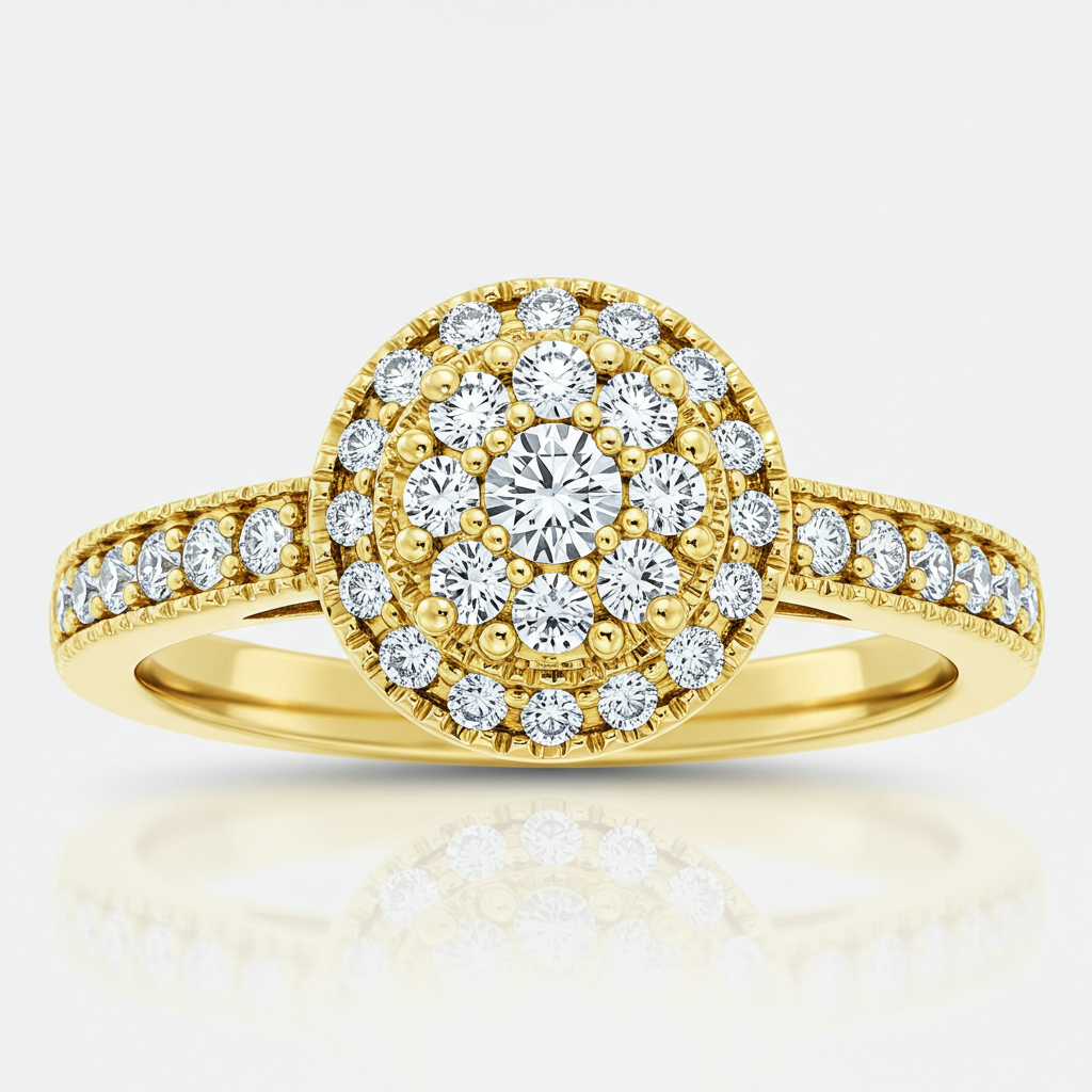 This exquisite Halo Cluster Ring defines sophistication and timeless elegance, crafted meticulously in radiant 18KT yellow gold. A brilliant central diamond is perfectly framed by a delicate halo of smaller, pave-set diamonds, maximizing sparkle and presence. The highly polished band ensures a comfortable fit for daily wear or special occasions. This piece serves as a magnificent testament to enduring beauty and refined taste, making it the perfect gift.
