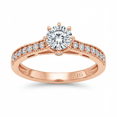 This exquisite engagement ring encapsulates modern romance with its luxurious 18KT rose gold setting. A dazzling, brilliant-cut diamond of VVS clarity takes center stage, radiating unparalleled fire and brilliance. The slim band is meticulously detailed with micro-pave set accent diamonds, enhancing the overall sparkle. This piece represents a timeless symbol of commitment and sophisticated design, handcrafted to perfection.