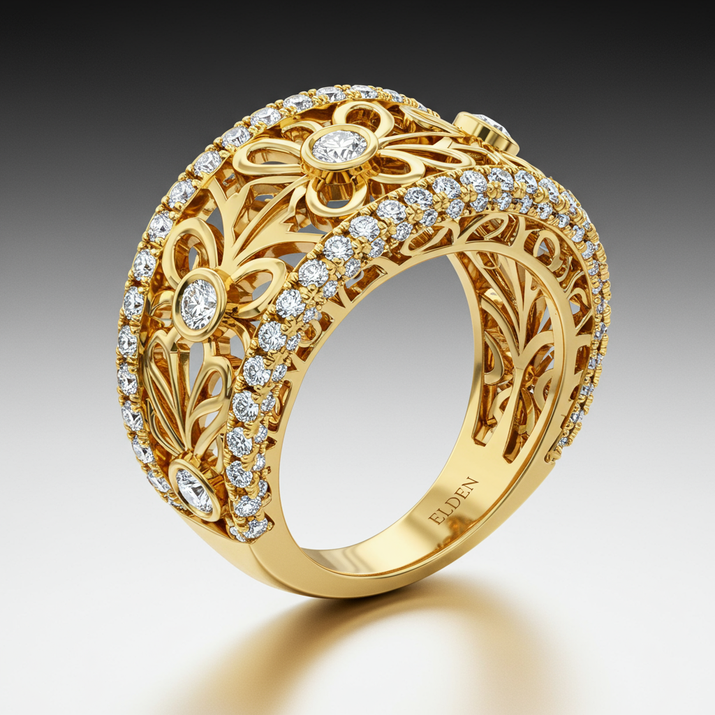 The 'Elden Ring R34' is a masterwork of sculptural artistry, drawing inspiration from legendary epochs and mythic forms. Crafted in brilliant 18KT yellow gold, its imposing profile features intricate lattice work and a commanding central bezel setting. This statement piece captures the essence of divine craftsmanship, designed for those who command attention and appreciate breathtaking detail. It is perfectly complemented by meticulously placed accent diamonds that illuminate the complex metalwork.