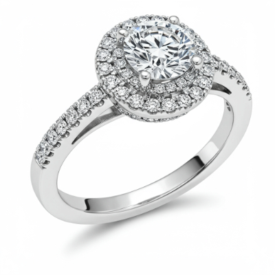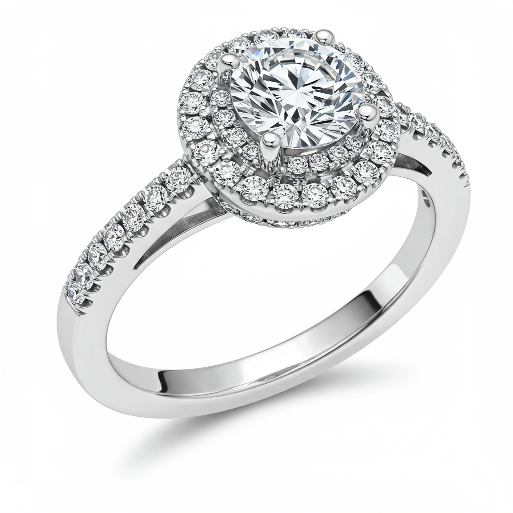The Halo Ring is the epitome of brilliance, featuring a magnificent 1.00 carat round diamond meticulously encircled by a glittering halo of VVS accent diamonds. Set in lustrous 18KT white gold, this classic design maximizes light return and visual impact, making the center stone appear significantly larger and more radiant. The delicate pave band adds a continuous line of sparkle, symbolizing enduring love and commitment. This ring is a timeless choice for a statement engagement piece, embodying exceptional craftsmanship and luxury.