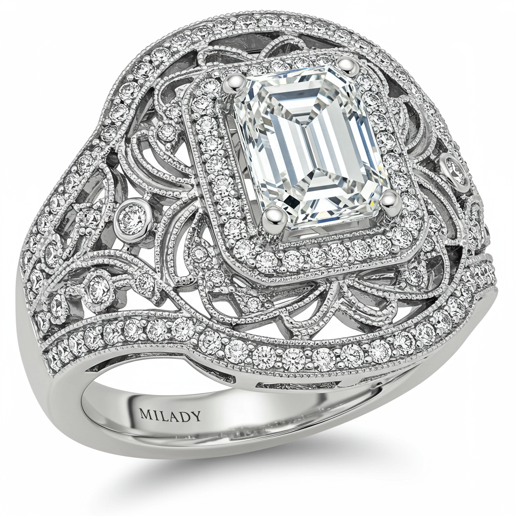 The Milady Elden Ring is a masterpiece of intricate craftsmanship, evoking the grandeur of ancient royalty. Set in luminous 18KT white gold, this ring features a majestic center emerald cut diamond embraced by delicate filigree work and precision-set round brilliant accents. Its architectural beauty and breathtaking sparkle make it the ultimate heirloom piece. This design promises both comfort and unforgettable presence, capturing light from every angle.