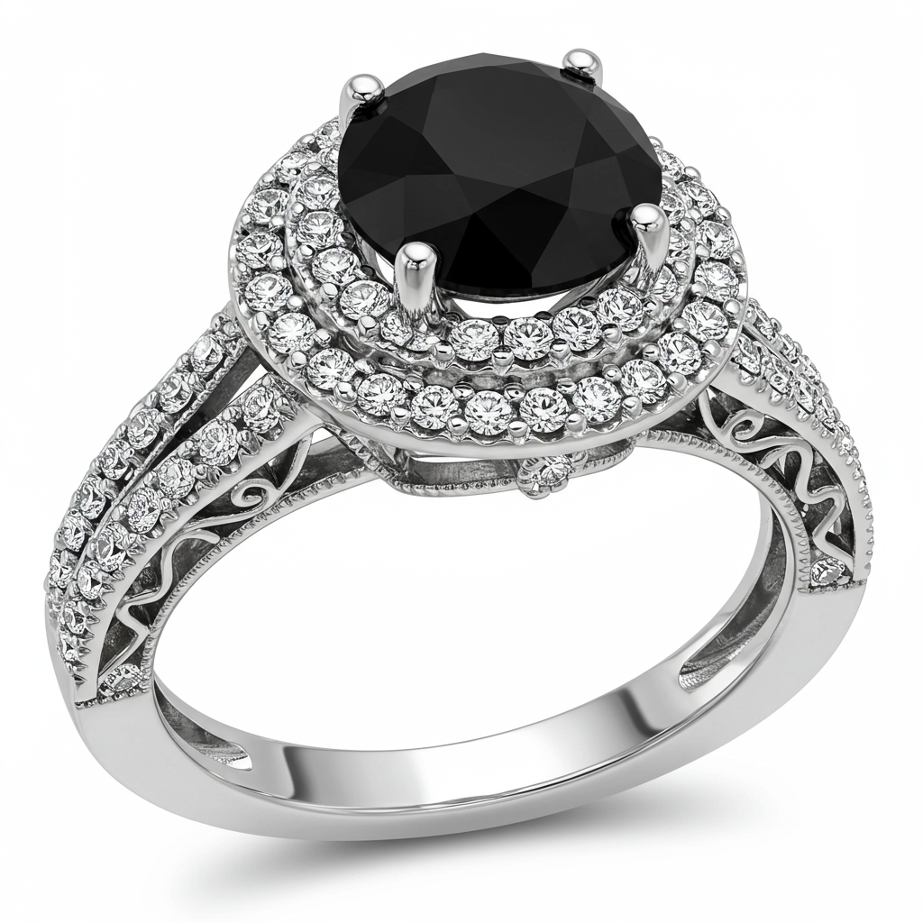 This striking engagement ring features a magnificent, deep black round diamond centerpiece, offering a bold, modern twist on classic luxury. Set in brilliant 18KT white gold, the center stone is dramatically framed by a glittering halo and paved band of high-clarity white diamonds. This piece symbolizes a love that is unique, enduring, and powerfully contrasted, making it an unforgettable statement of commitment.