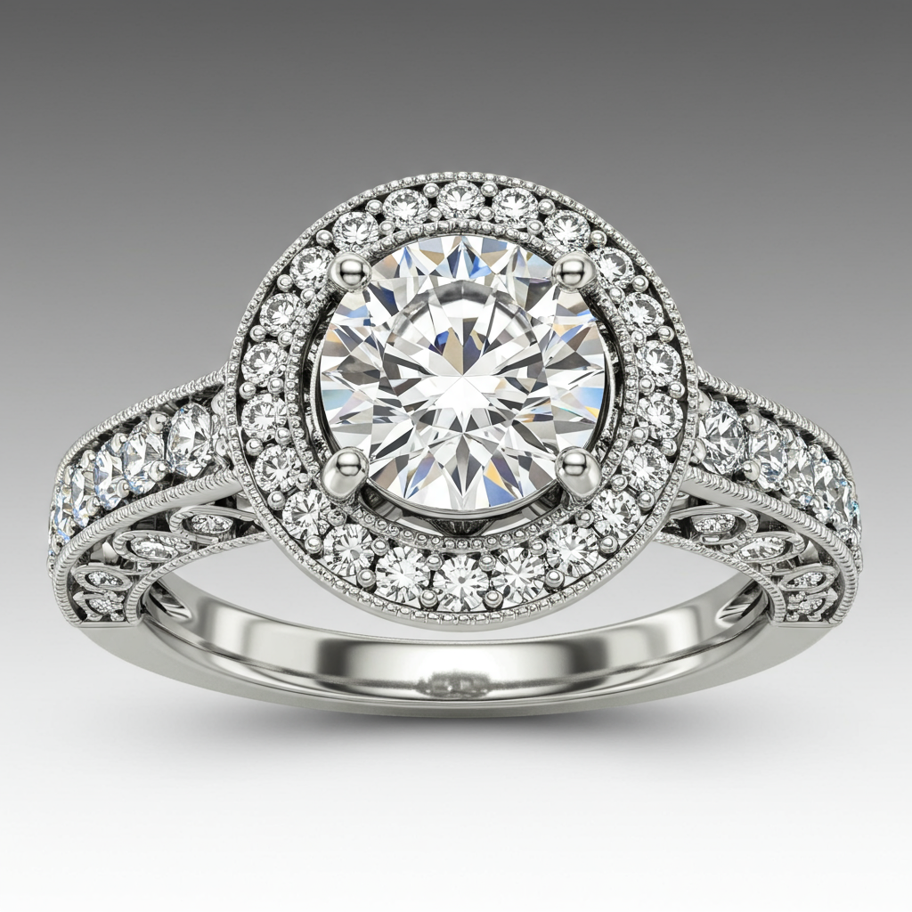 The Fia Elden Ring is a majestic declaration of timeless commitment, featuring a stunning central diamond embraced by a meticulous halo setting. Crafted in radiant 18KT white gold, this design draws inspiration from classic European regalia, offering unparalleled sparkle and structural elegance. The shoulders are intricately paved, lending a continuous stream of brilliance that accentuates the substantial center stone. This ring is designed for those who seek a magnificent and enduring symbol of their extraordinary bond, blending intricate craftsmanship with powerful presence.