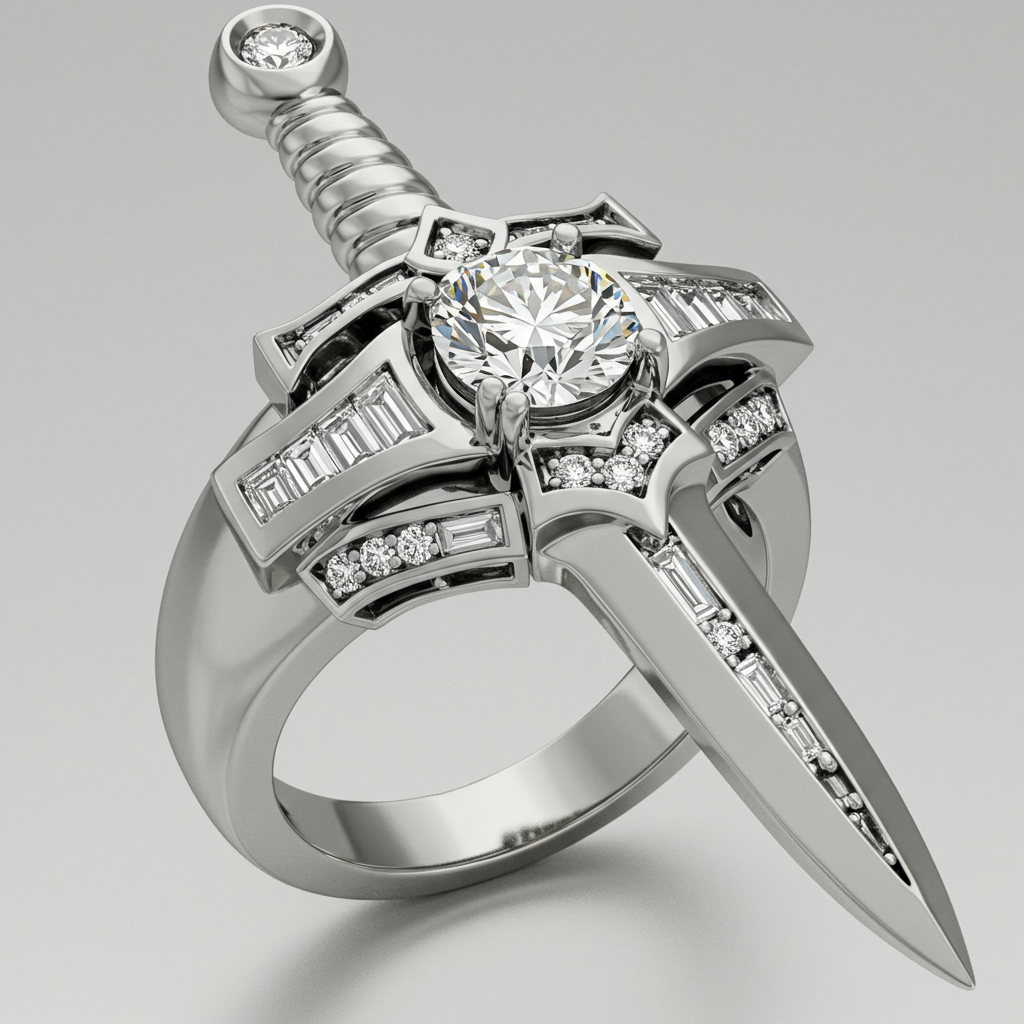 A masterful recreation of the iconic Greatsword aesthetic, this ring embodies both ancient power and modern elegance. Crafted in polished 18KT white gold, the design features intricate filigree mimicking a formidable weapon hilt. Channel-set baguette diamonds run along the band, symbolizing the blade's edge, culminating in a brilliant central Round VVS diamond. This bold statement piece is perfect for those who appreciate unmatched craftsmanship and carry the spirit of high fantasy.