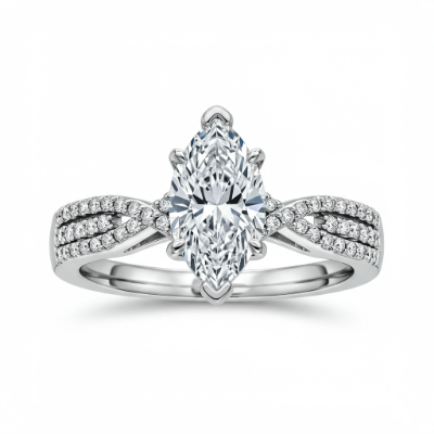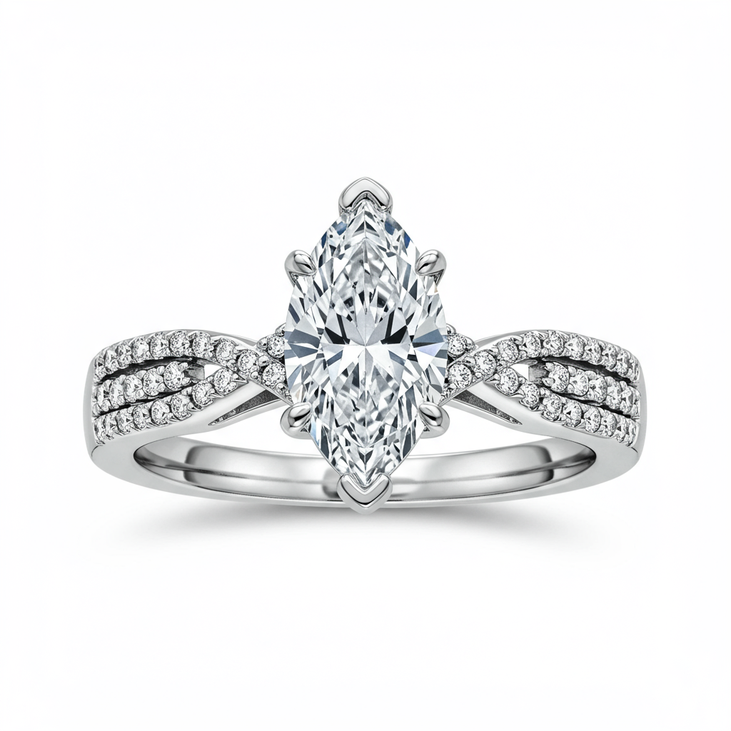 Elegance defined, this marquise engagement ring captures light and attention with its striking center diamond. Set in luxurious 18KT white gold, the sophisticated marquise stone is complemented by delicate pave-set diamonds along the band, enhancing its brilliance and sparkle. This piece embodies timeless romance and modern design, making it the perfect symbol of a lifelong commitment. The precise setting ensures maximum security and exceptional visibility of the high-quality stones.