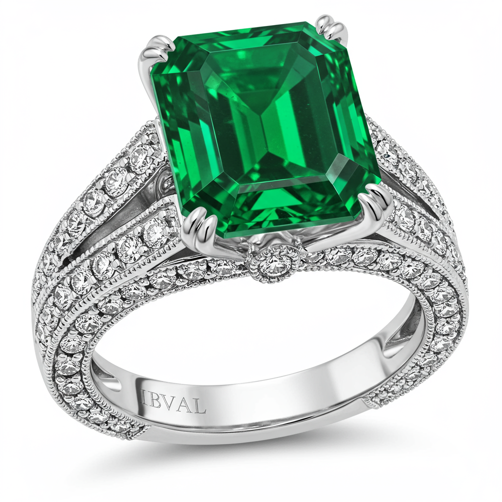 This magnificent engagement ring features a stunning, perfectly proportioned 1.50 carat emerald-cut natural emerald centerpiece, held securely in a clean four-prong setting. The shoulders of the 18KT white gold band are elegantly adorned with pavé-set VVS brilliant round diamonds, adding exceptional sparkle and brilliance. Its sleek profile and refined geometry offer a modern yet timeless expression of commitment and luxury. This design beautifully merges vibrant color with classic diamond elegance, making it an exquisite heirloom piece.
