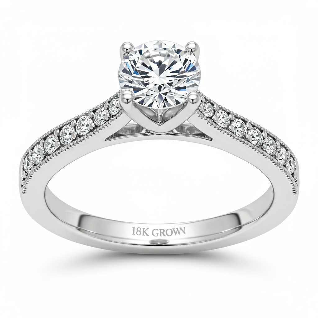 This breathtaking engagement ring centers around a magnificent, ethically sourced lab grown diamond, showcasing superior brilliance and fire. Crafted in luxurious 18KT white gold, the sophisticated setting elevates the primary stone with delicate claw prongs. The band is meticulously adorned with a continuous line of pave-set lab grown diamonds, providing an undeniable sparkle. This piece perfectly merges classic design with modern sustainable luxury, making it an ideal symbol of commitment.