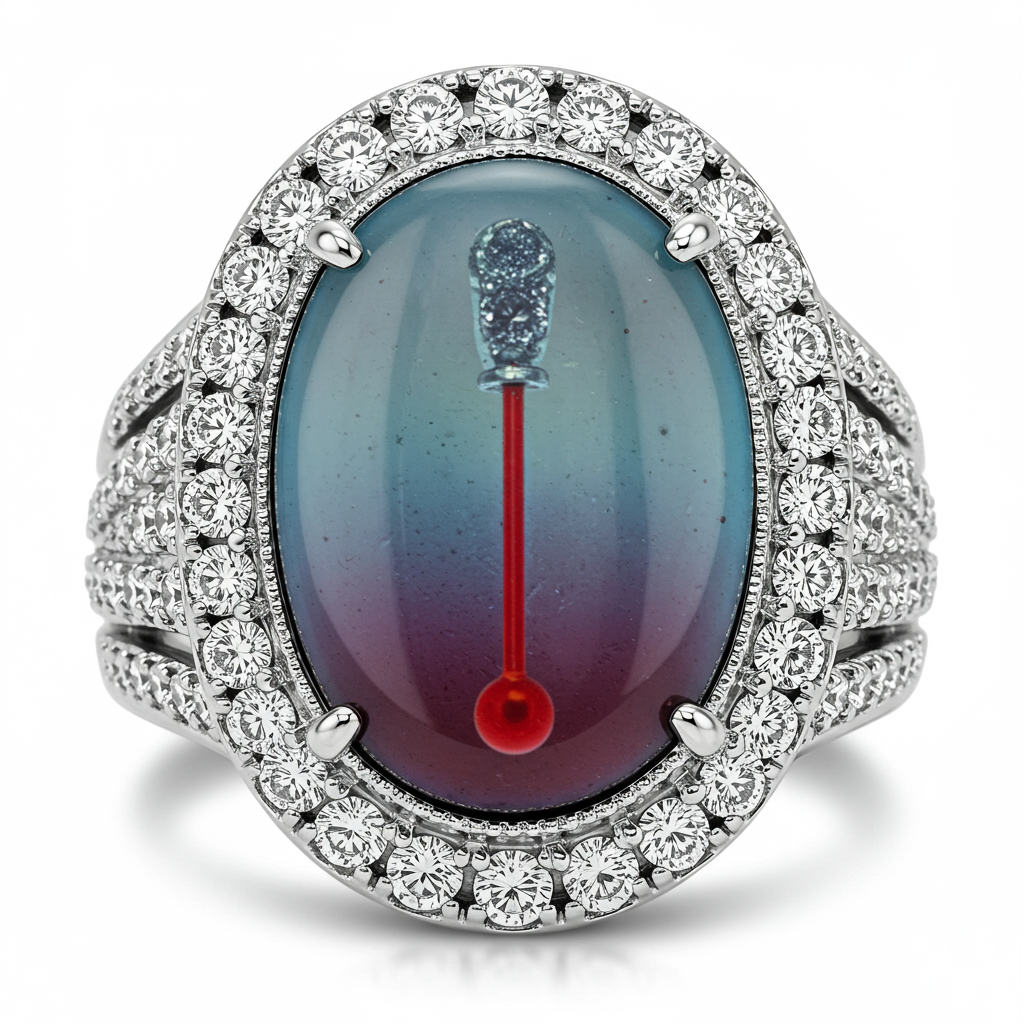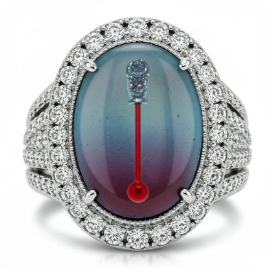 The 'mood ring moods and colours' is a captivating 18KT white gold statement piece designed for dynamic self-expression. Centered on the band is an oval thermochromic inlay that subtly shifts color in response to temperature, reflecting the wearer's inner state. This mesmerizing centerpiece is framed by a dazzling halo of precision-set VVS round brilliant diamonds. It represents a perfect fusion of classic elegance and personalized, wearable technology, making it a truly unique addition to any fine jewelry collection.