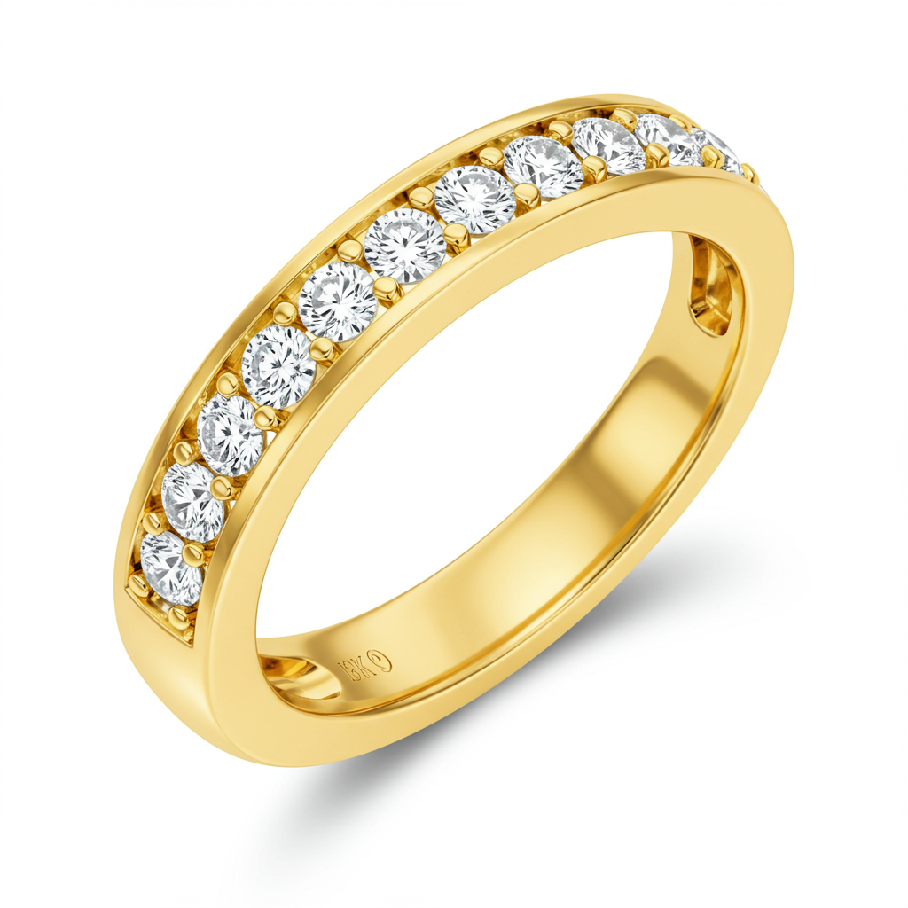 This classic dome band is expertly crafted in rich 18KT yellow gold, offering a substantial and timeless presence on the hand. A delicate row of fifteen VVS round brilliant diamonds, meticulously channel-set, introduces a subtle flash of brilliance. Designed for both daily wear and elegant stacking, this ring embodies understated luxury and sophisticated craftsmanship. It serves as a perfect wedding band or a luxurious anniversary gift.