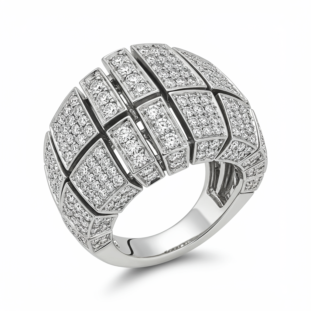 The Elden Ring Armor Set piece captures the epic grandeur of high fantasy, designed as a bold sculptural statement ring. Crafted in brilliant 18KT white gold, the segmented architecture mirrors intricate armor plating, creating a truly unique piece of wearable art. This dramatic ring is meticulously paved with brilliant VVS diamonds, adding dazzling contrast to the rugged, powerful design. It serves as a symbol of strength and sophisticated craftsmanship, perfect for the discerning collector who seeks the extraordinary.