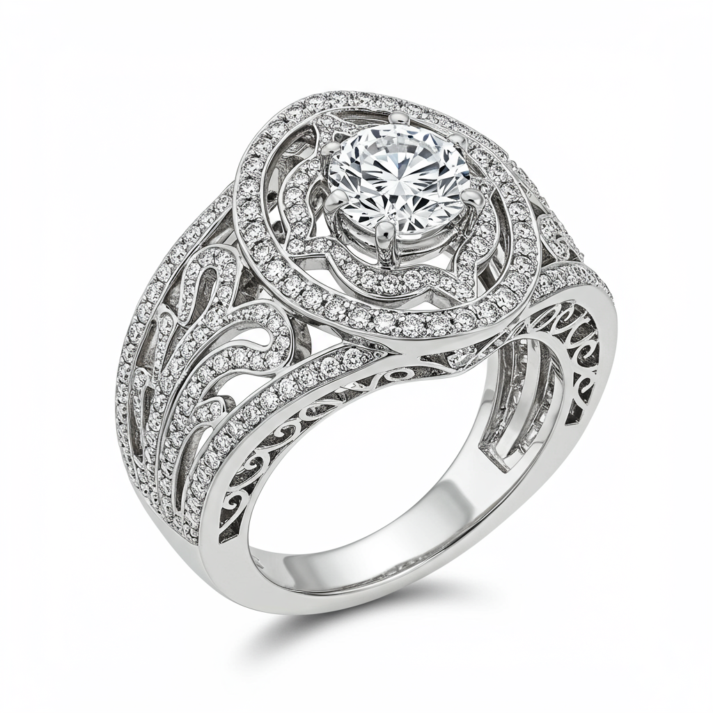 This magnificent ring is inspired by the formidable legends associated with the Lands Between. Crafted in radiant 18KT white gold, its complex, architectural structure embodies raw power and mythical beauty. A substantial central diamond, framed by a dynamic halo of micro-pave accents, draws the eye immediately. This piece is a testament to mastery, merging intricate filigree work with exceptional diamond brilliance, ensuring it stands out as a true collector's item.