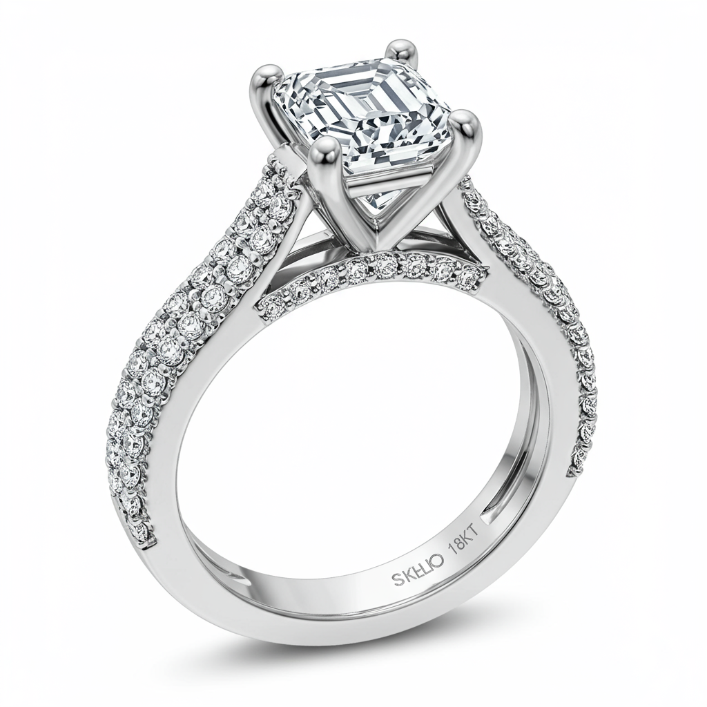 The Grand Emerald Engagement Ring captures timeless elegance with its meticulously set center stone. This exquisite piece features a high-carat emerald cut diamond secured by elegant claw prongs. The 18KT white gold band is delicately adorned with micro-pave diamonds, enhancing the brilliance and adding subtle dimension. It is a breathtaking symbol of commitment, crafted for enduring beauty and sophisticated wear, perfect for a modern classic aesthetic.
